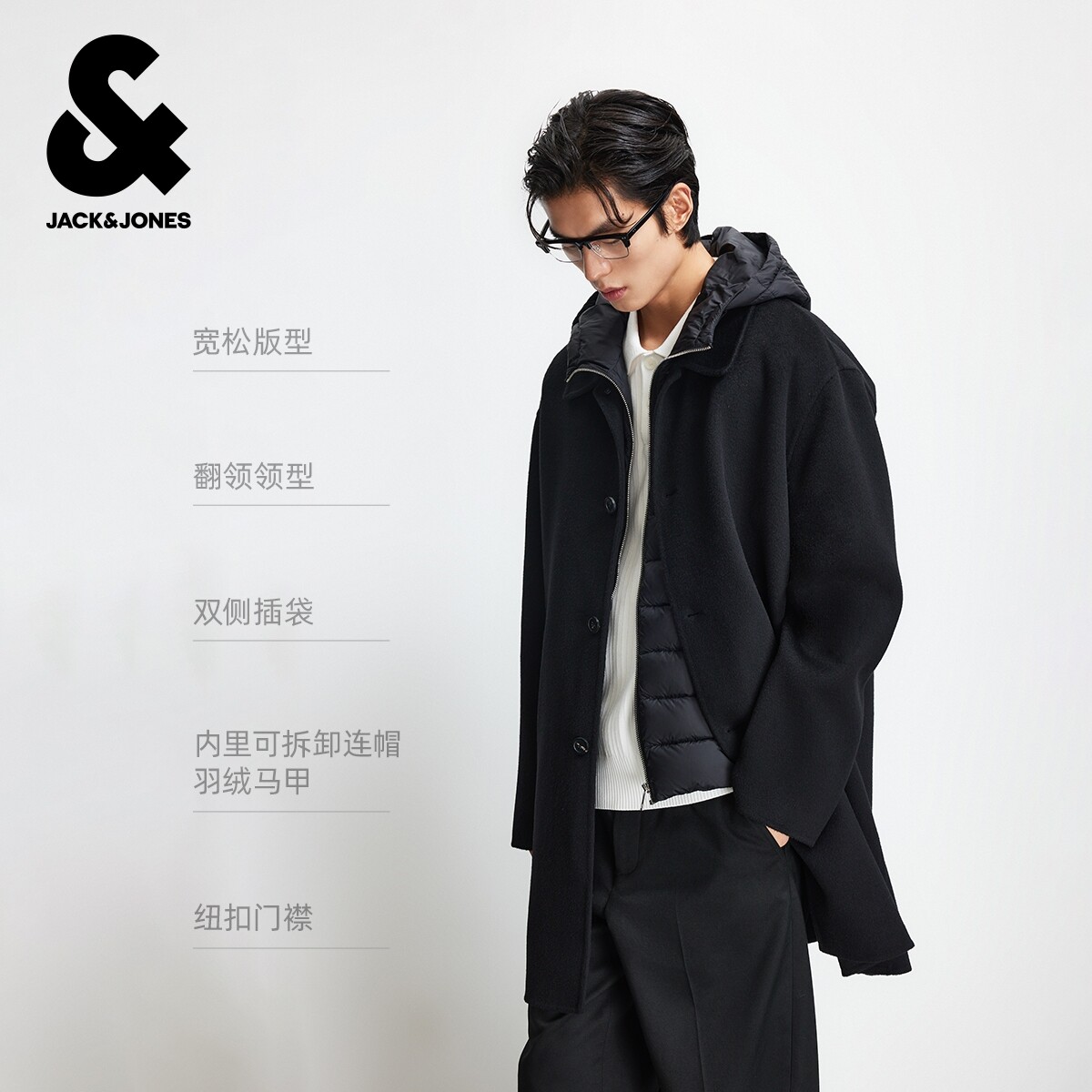 淘宝vj区绫致杰克琼斯男秋毛呢大衣可拆卸马甲百搭风羊毛连帽长款外套