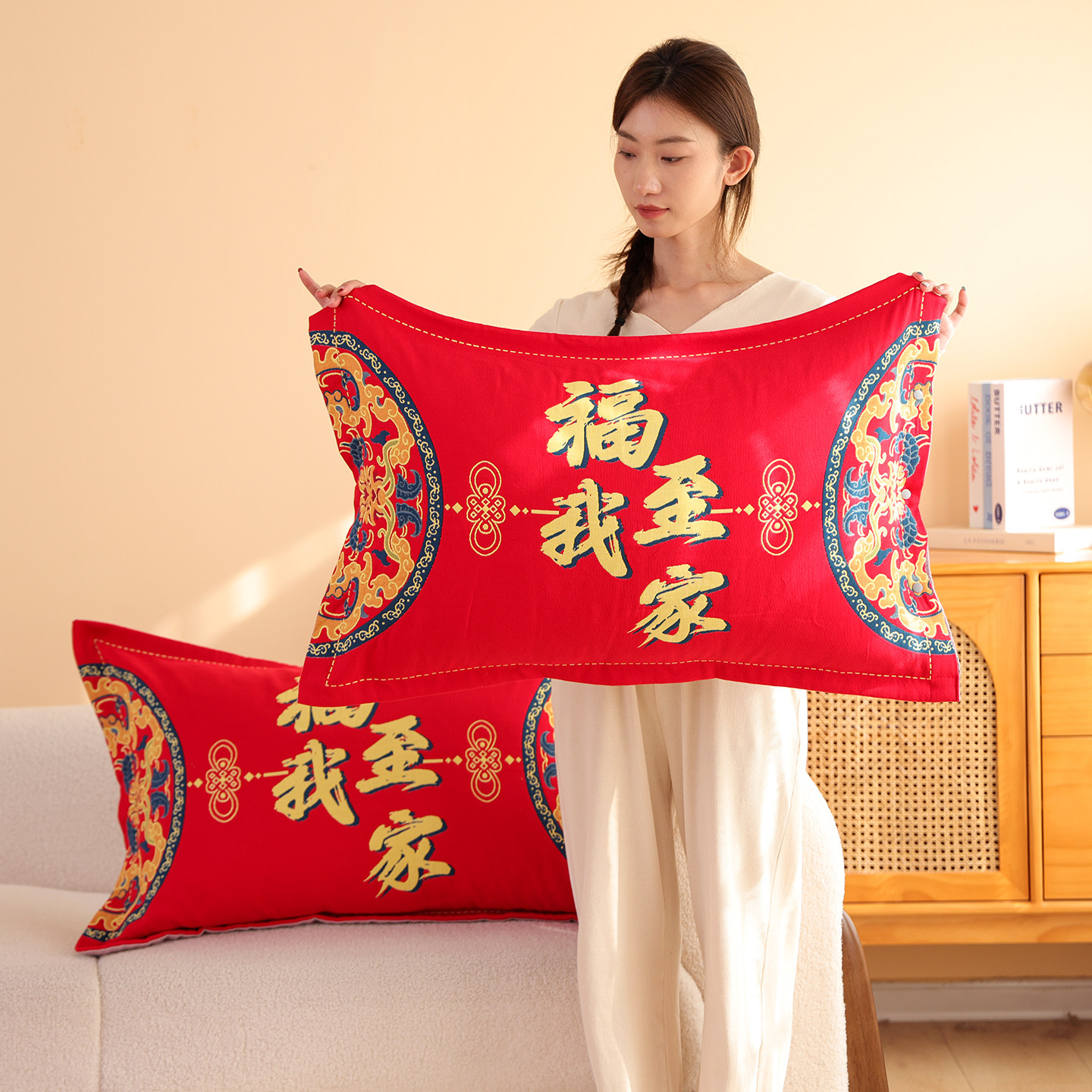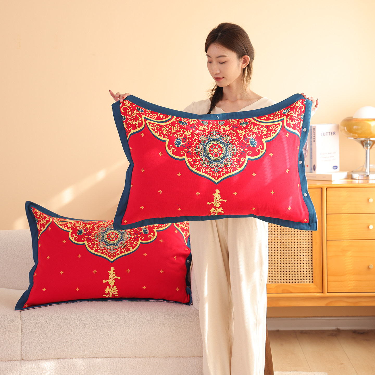 这款纯棉纱布按扣枕套一对装,专为本命年新年设计,寓意吉祥喜庆。采用100%优质全棉纱布面料,柔软亲肤、透气吸汗,带来舒适睡眠体验。经典大红色调,洋溢浓郁节日氛围,特别适合新婚夫妇或本命年人士使用,象征红红火火、幸福美满。枕套尺寸为48×74cm,适配标准枕头,边缘采用精致按扣设计,开合便捷,不易脱落,兼顾美观与实用。纱布质地轻盈细腻,越洗越柔软,经久耐用。无论是自用还是作为新婚、乔迁、春节礼品,都寓意美好,传递温暖祝福。一对装设计,实用又贴心,是新年焕新家居的理想之选。