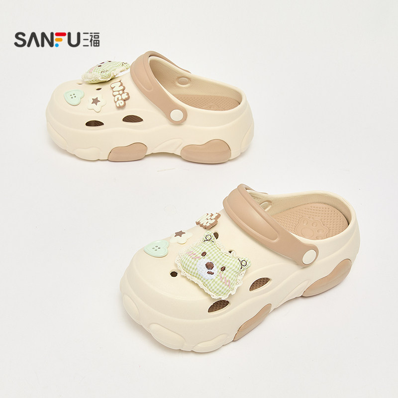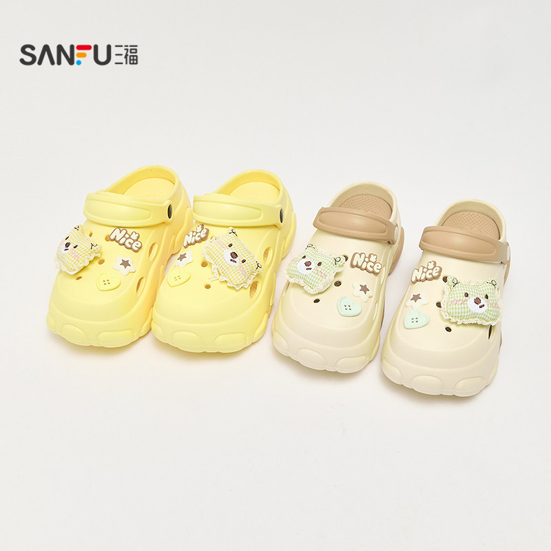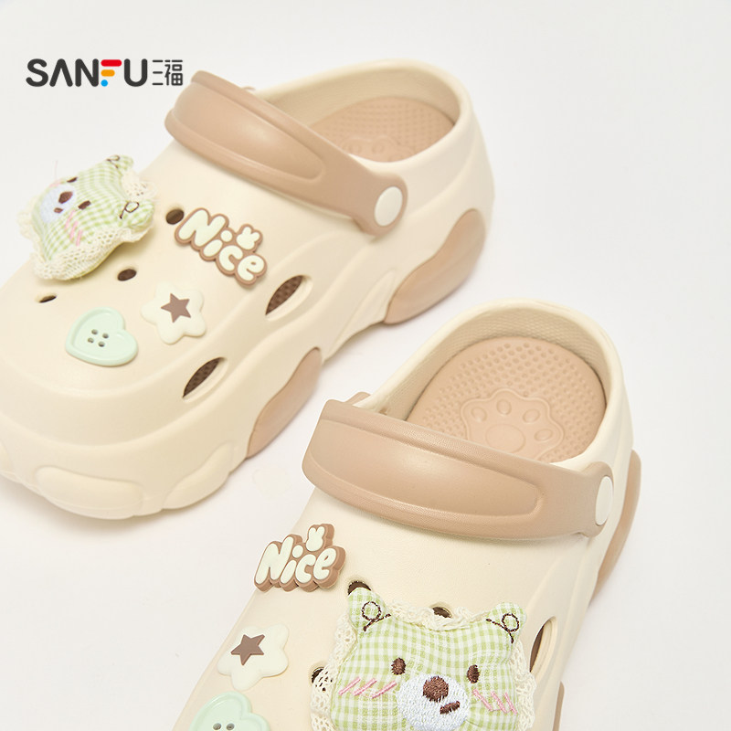 三福女凉拖鞋852563,专为夏日打造,舒适透气,轻松应对炎热天气。采用经典洞洞鞋设计,鞋面遍布透气孔洞,有效排汗散热,久穿不闷脚。鞋身轻盈柔软,EVA材质防滑耐磨,适合日常出行、海滩度假等多种场景。亮点在于鞋侧点缀萌趣玩偶滴塑扣件,可自由拆卸更换,增添个性与趣味,轻松打造甜美俏皮风格。简约百搭的配色,轻松搭配裙装或休闲裤,是夏季衣橱的实用单品。三福品质保障,穿着安心,让每一步都清爽自在,尽享夏日惬意时光。