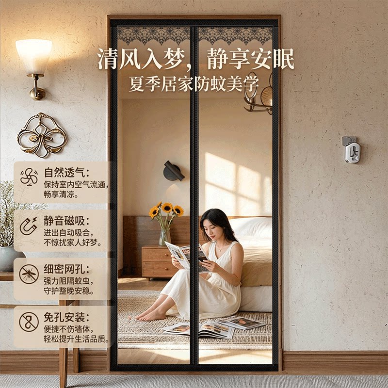 2026新款高档防蚊虫夏季家用防蚊门帘,采用优质加密纱网,透气防蚊两不误,有效阻隔蚊虫、飞蛾等小昆虫进入室内。门帘内置强力磁吸条,闭合紧密无声,开关便捷,回吸迅速,确保日常通行顺畅的同时维持密封性。边框采用环保材质,结实耐用,抗撕裂、不易变形,适配多种门型。简约时尚设计,透光性好,兼顾隐私与通风,适用于阳台、厨房、卧室等家居空间。安装简便,免打孔设计,可反复清洗使用,是夏季防蚊的理想选择,为您打造清爽舒适的居家环境。