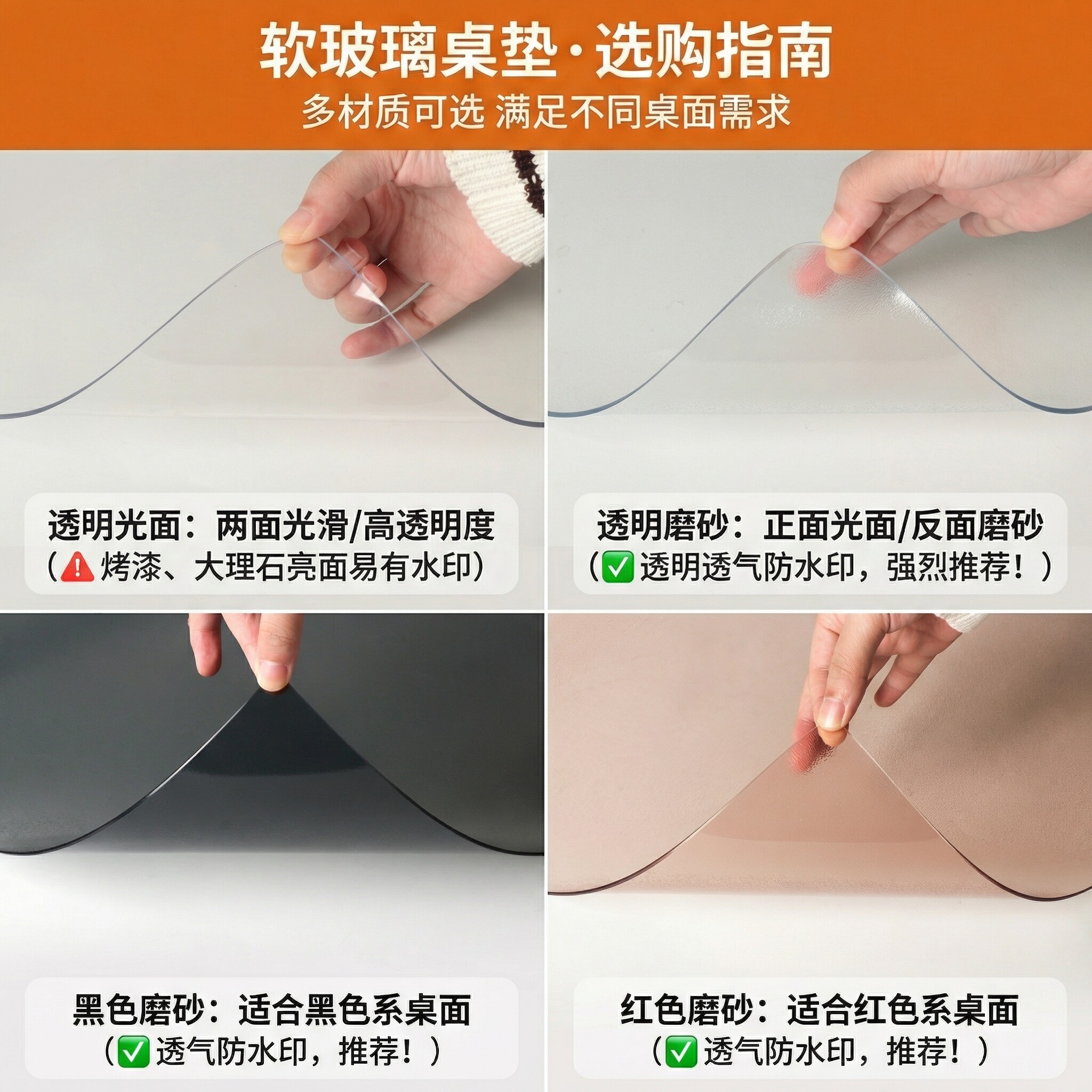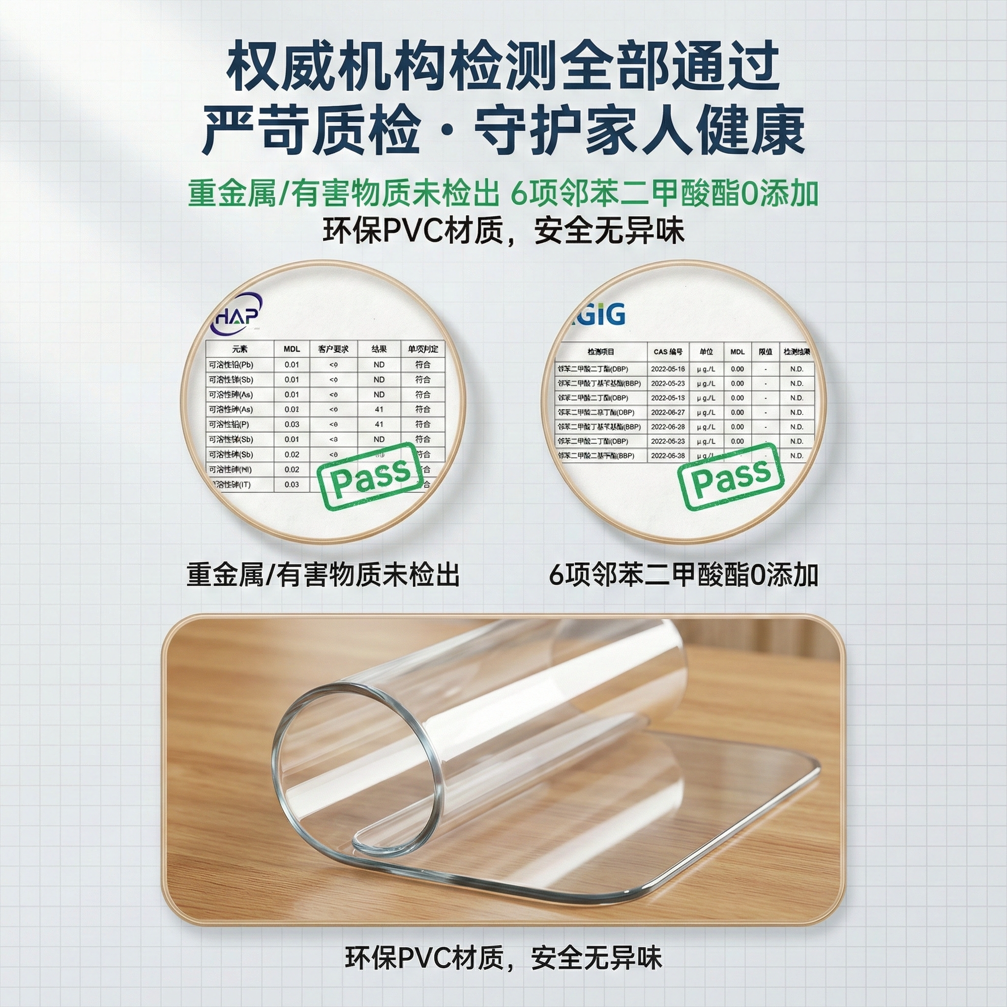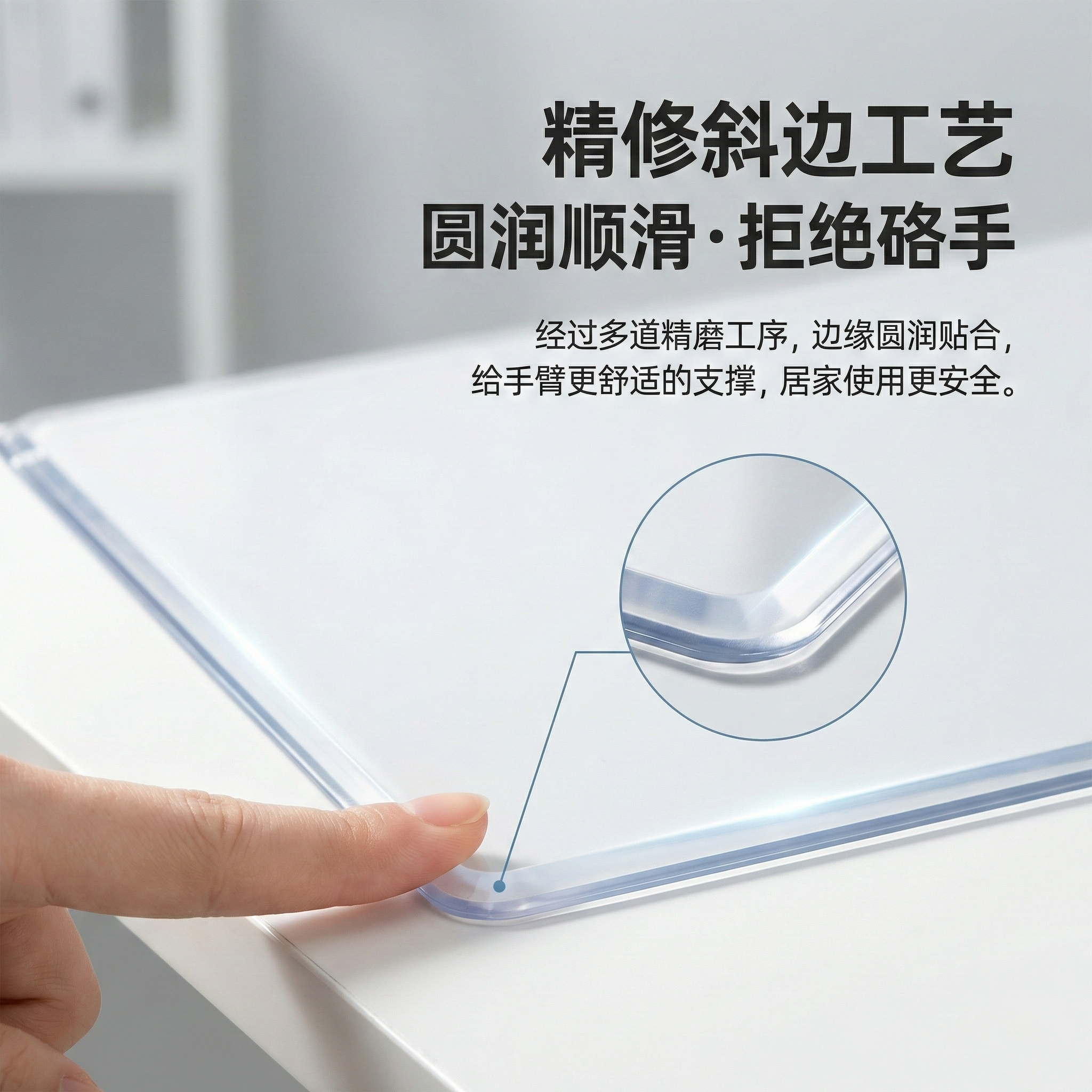 透明软玻璃桌垫(PVC桌布)是一款实用又美观的家居保护用品。采用优质环保PVC材质,透明度高,柔韧耐用,能有效保护餐桌、茶几等家具表面免受刮擦、烫痕、水渍和油污侵害。其防水防油特性使清洁变得轻松,只需用湿布一擦即净,免洗便捷。表面光滑,耐高温,可承受日常热餐具放置,不变形、不发黄。适用于各种风格的桌面,既保持家具原有美感,又延长使用寿命。无论是家庭用餐、办公桌面还是茶几装饰,这款水晶板胶垫都是理想选择,兼顾实用性与装饰性,是现代家居的贴心之选。