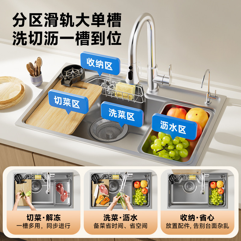 天猫雨虹飞鱼厨房洗菜盆加厚304不锈钢水槽大单槽多功能家用洗菜池