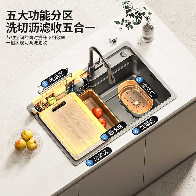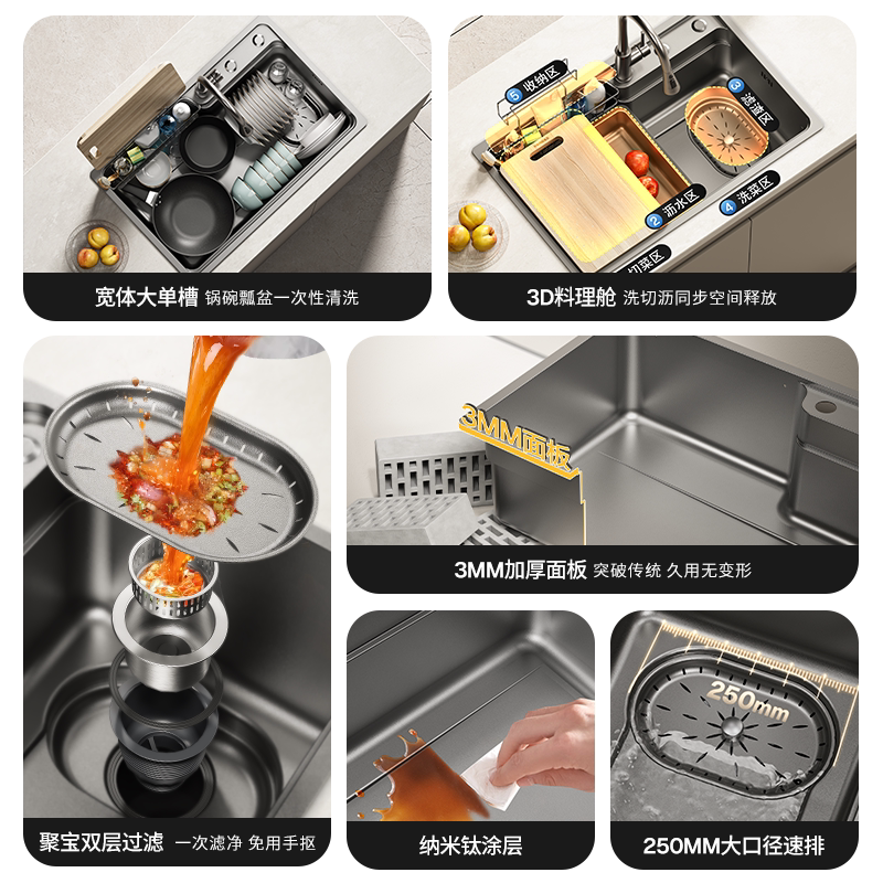 天集渣水槽一体式多功能大单槽304不锈钢厨房洗菜盆数显鲸鱼双瀑布