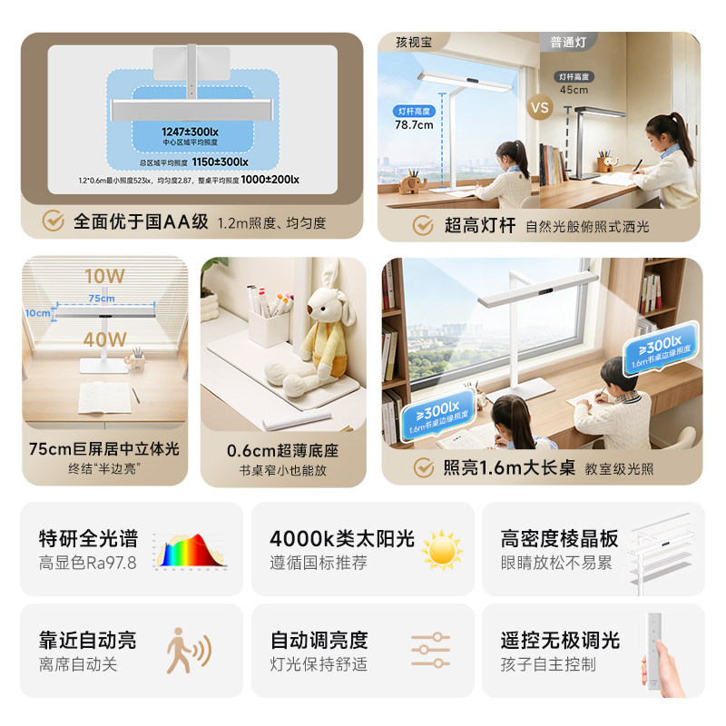 孩视宝护眼桌面大路灯台灯i01专为小学生学习设计,采用全光谱光源,模拟自然光照明,有效减少蓝光危害,提供均匀、无频闪的舒适光环境,助力防控近视。灯体高度可调,光线覆盖范围广,桌面及书架区域均明亮无阴影,避免用眼疲劳。搭载智能感光系统,可根据环境光线自动调节亮度,保护视力。简约设计节省空间,触控操作便捷,定时休息提醒功能帮助孩子养成良好用眼习惯。i01集护眼、实用与智能于一体,是孩子学习阅读的理想照明伙伴,守护明亮双眸,助力健康成长。