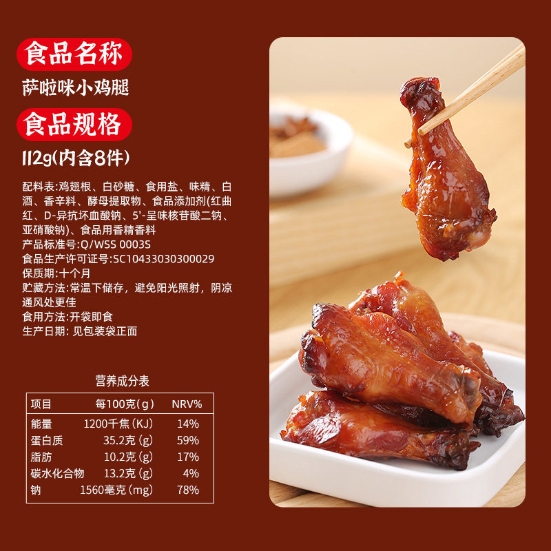 萨啦咪小鸡腿烤制翅根是一款风靡网络的网红鸡肉零食,精选优质鸡翅根为原料,采用传统烤制工艺结合现代调味技术,外焦里嫩、香气扑鼻。肉质紧实有嚼劲,咸香微辣,回味悠长,既保留了鸡肉的鲜美,又融入了独特香料风味。独立小包装设计,方便携带,开袋即食,是追剧、办公、旅行时的理想休闲小食。无防腐剂添加,健康美味兼顾,深受年轻消费者喜爱。无论是作为解馋零食还是佐酒佳品,萨啦咪小鸡腿都能带来满满的满足感,成为零食界的人气爆款。