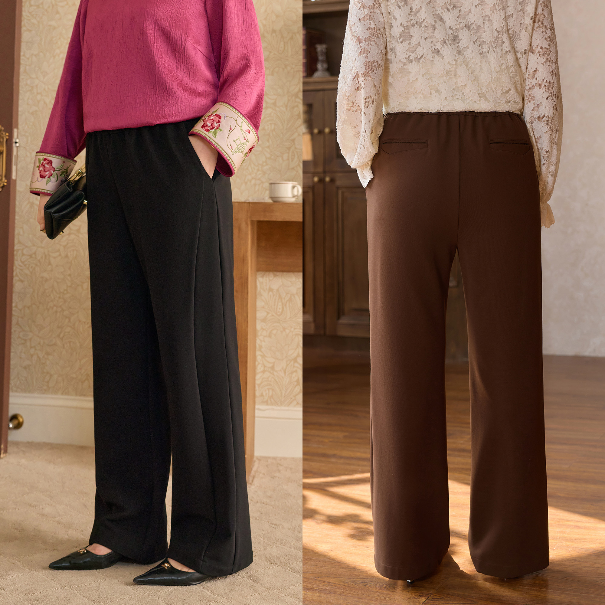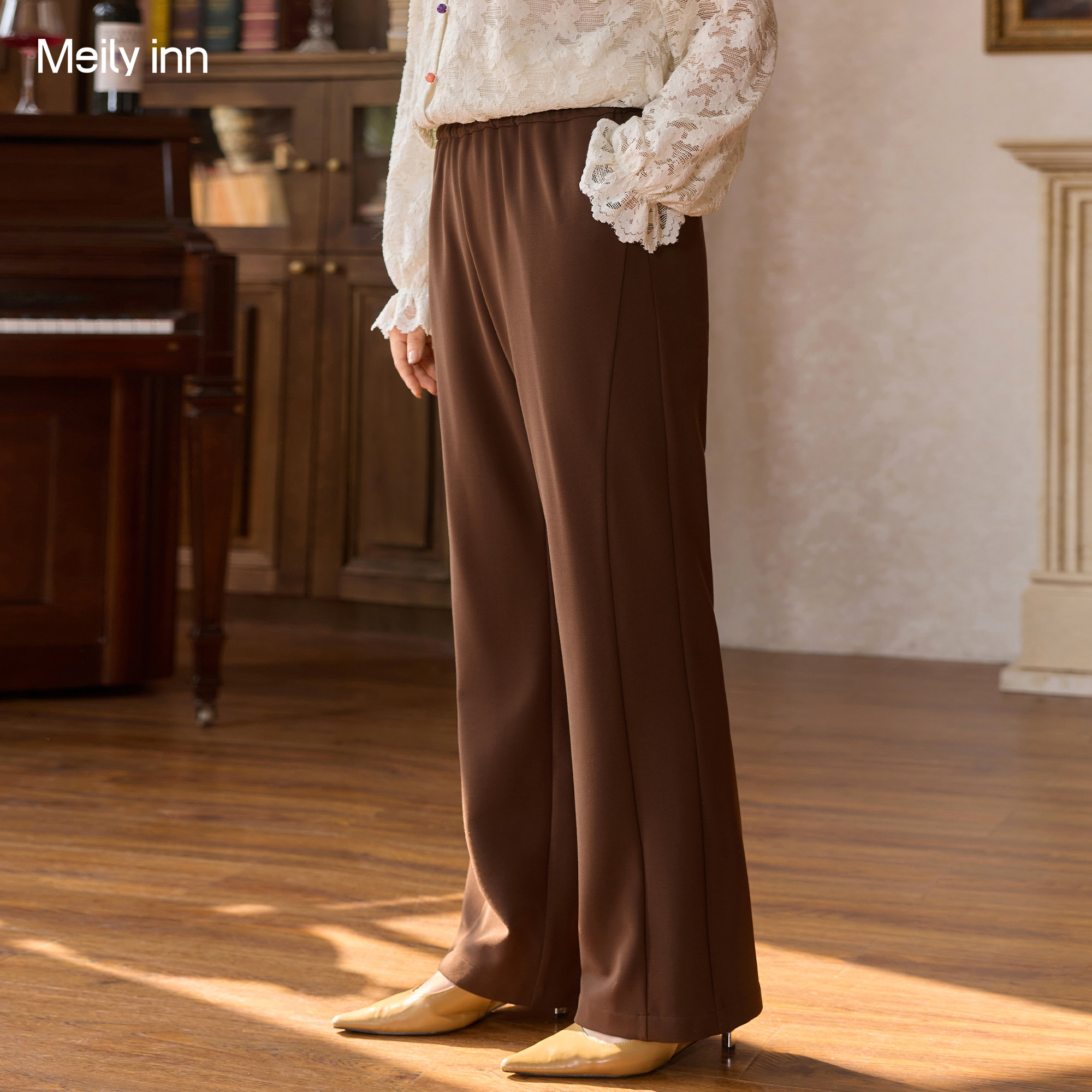 天猫美丽客栈高端大码女装咖色直筒裤高腰阔腿裤宽松显瘦百搭休闲裤子