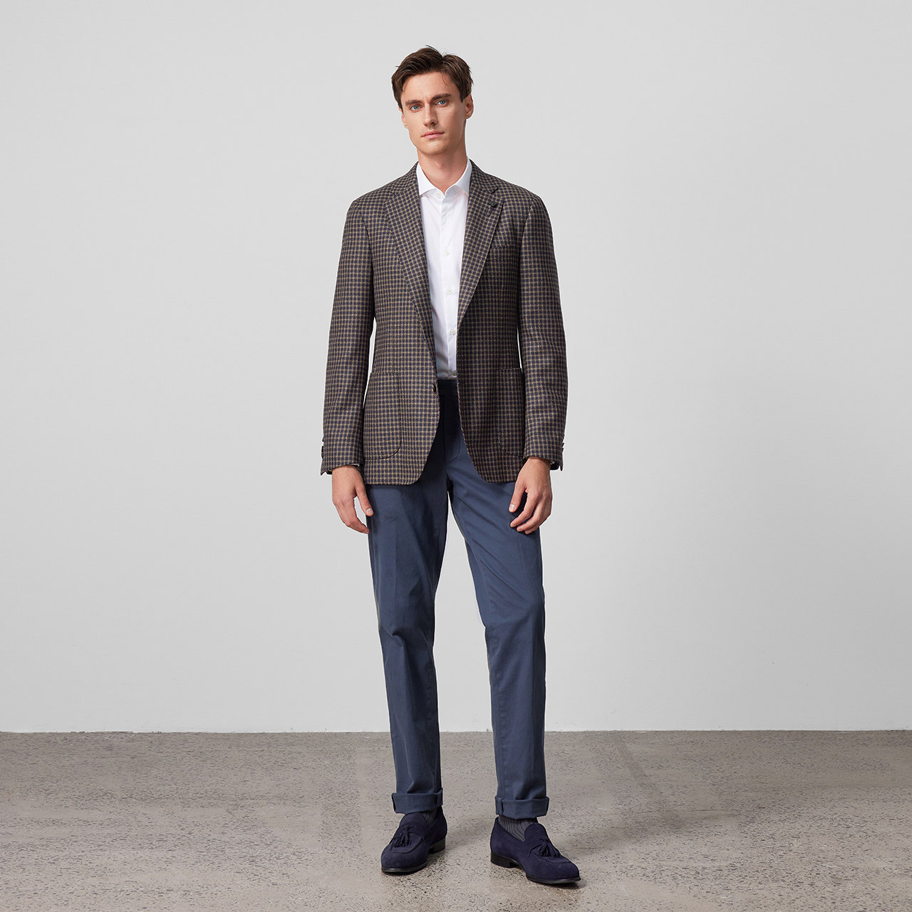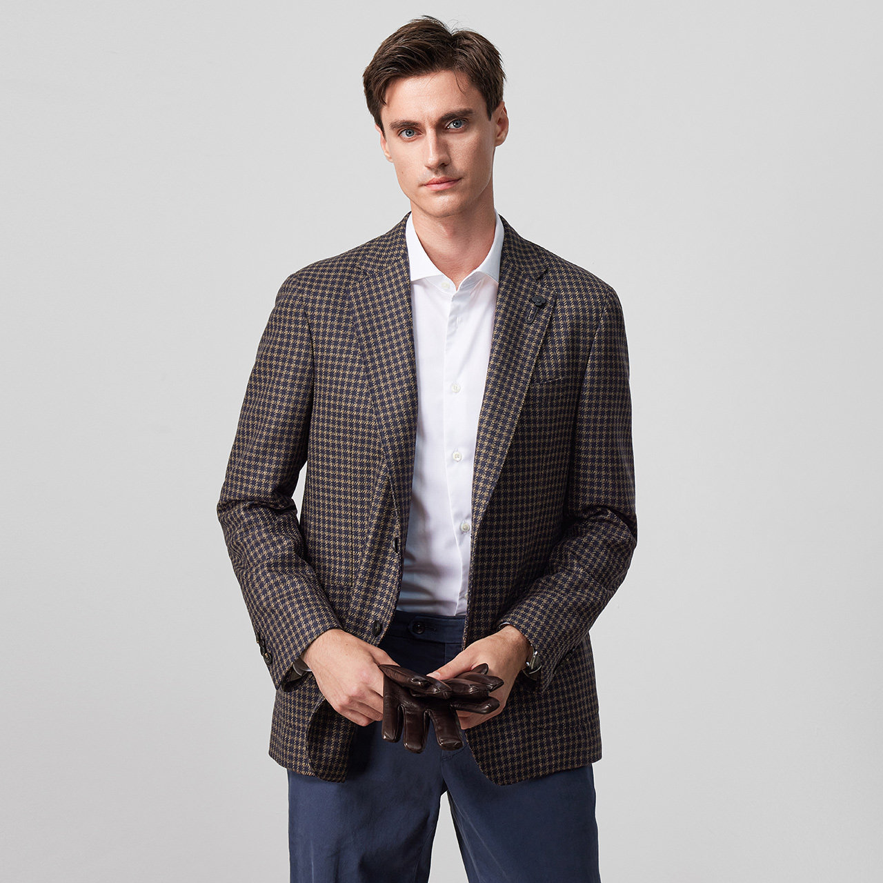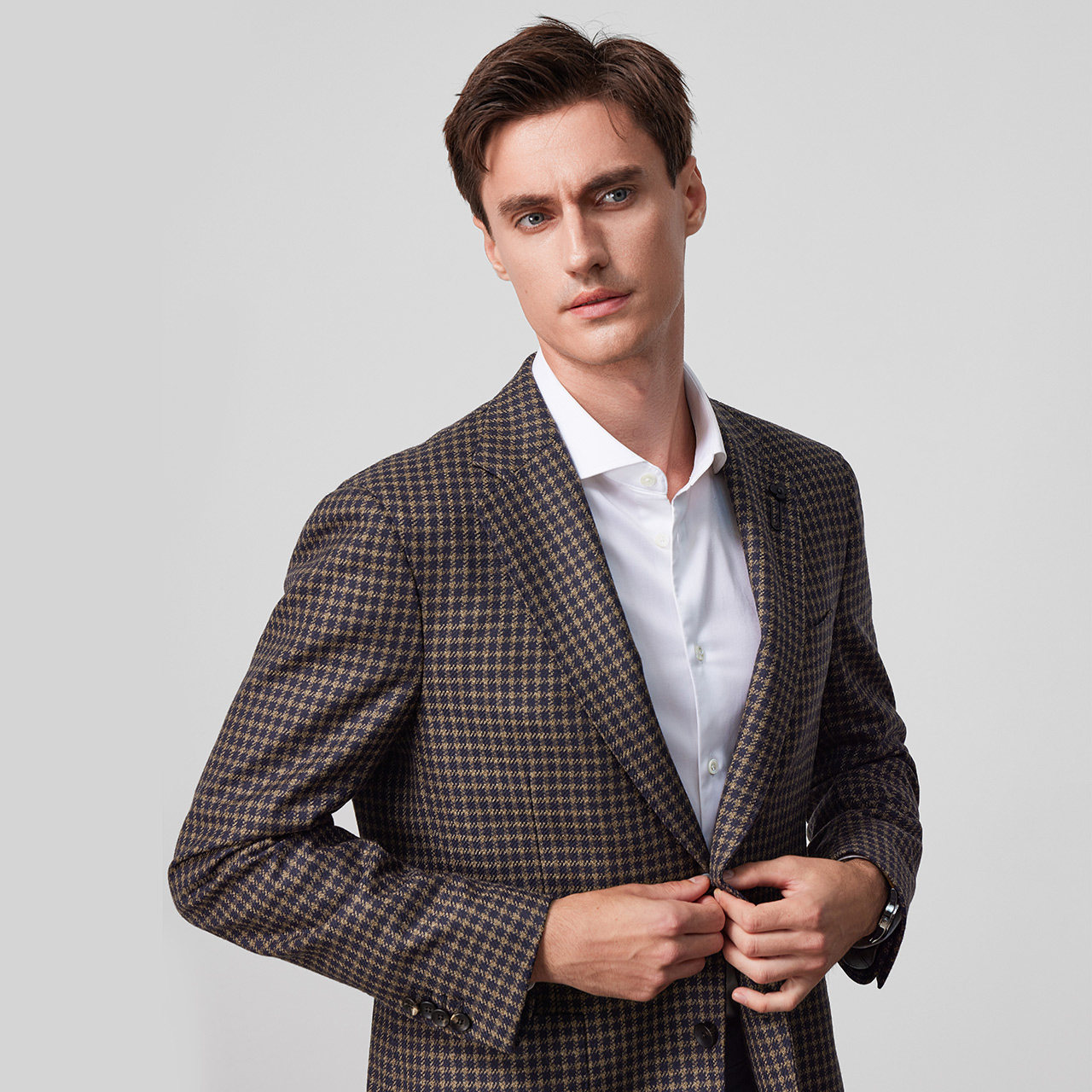 LARDINI意大利进口羊毛千鸟格秋冬单西,精选优质羊毛面料,触感柔软、垂坠挺括,兼具保暖性与透气性。经典千鸟格纹样低调雅致,彰显意式优雅格调,适合商务通勤与休闲场合。剪裁修身得体,肩线自然流畅,细节处体现精湛工艺,如手工缝制扣眼、内衬精致压纹等。单排扣设计简约大方,搭配灵活,可轻松驾驭正装或混搭风格。LARDINI作为意大利顶级男装品牌,以匠心工艺与时尚美学著称,此款西装外套是秋冬衣橱的理想之选,展现男士内敛而精致的品味。
