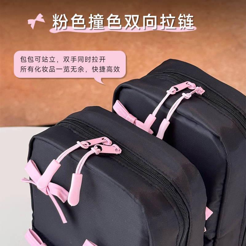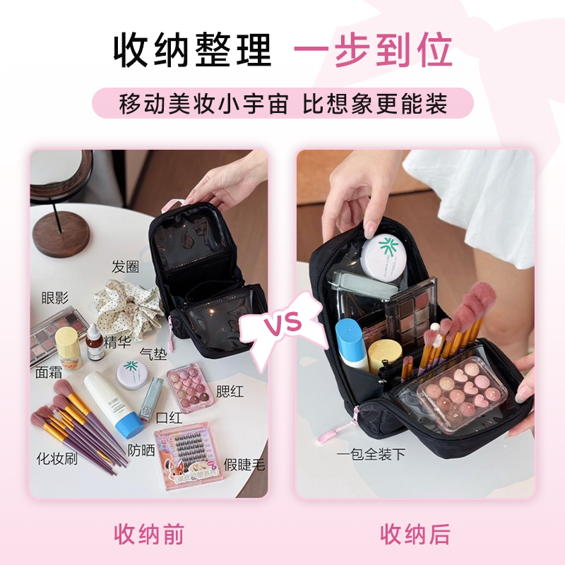 程十安立式化妆包是一款专为旅行和日常使用设计的大容量便携收纳包,外观简约可爱,实用性强。采用立式开合设计,取放物品方便,内部多层分区合理,可轻松收纳化妆刷、口红、粉底、洗漱用品等,避免杂乱。优质防水面料易清洁,结实耐用,拉链顺滑不卡顿。小巧轻便,可手提或放入行李箱,是出差、旅行、居家的理想选择。无论是美妆爱好者还是学生党,都能轻松满足收纳需求,让化妆台和旅途更整洁有序。程十安联名款更添信赖感,颜值与功能兼具,是贴心又实用的美妆好帮手。