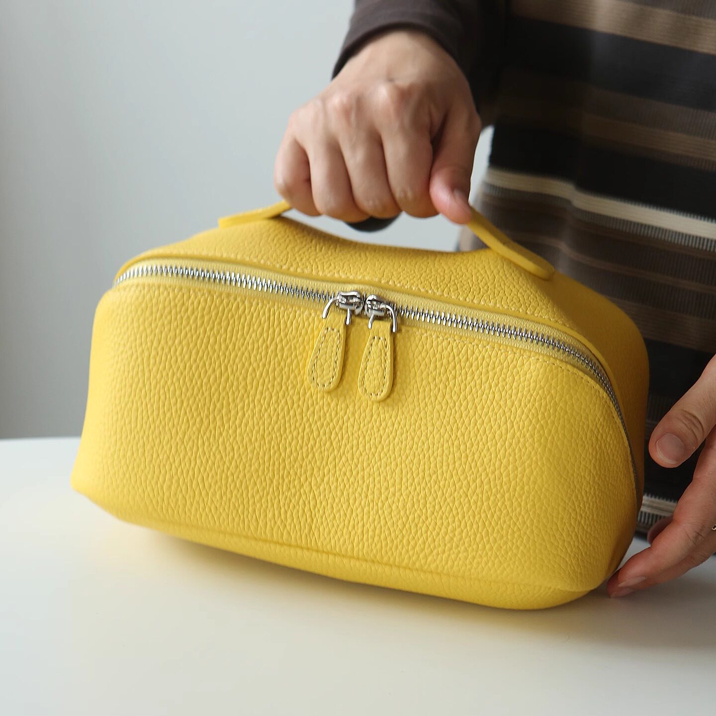 山叩Sainkho真皮化妆包,精选优质头层牛皮打造,质感细腻,耐用环保。采用大开口设计,取放物品便捷,内部空间宽敞,分层合理,轻松收纳化妆品、洗漱用品及旅行小物。包身线条简约优雅,金属拉链顺滑耐用,细节彰显高端品质。无论是日常通勤、短途出行还是长途旅行,都能满足女性对实用与美观的双重需求。手提设计舒适便捷,可轻松放入行李箱或随身携带。山叩Sainkho致力于为现代女性提供兼具格调与功能的收纳解决方案,是追求品质生活的理想之选。