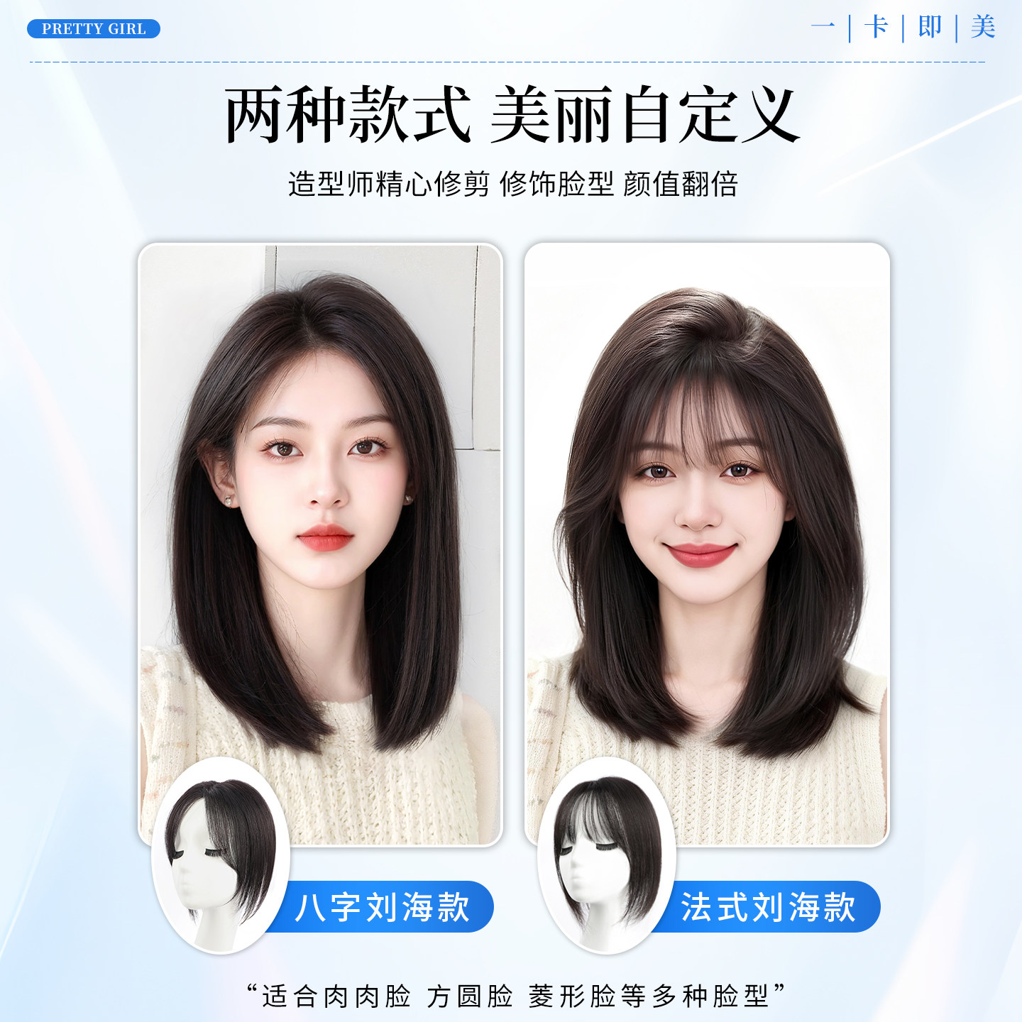 无需发卡魔术贴假发女片头顶补发蓬松颅顶自然前额真发刘海补发片