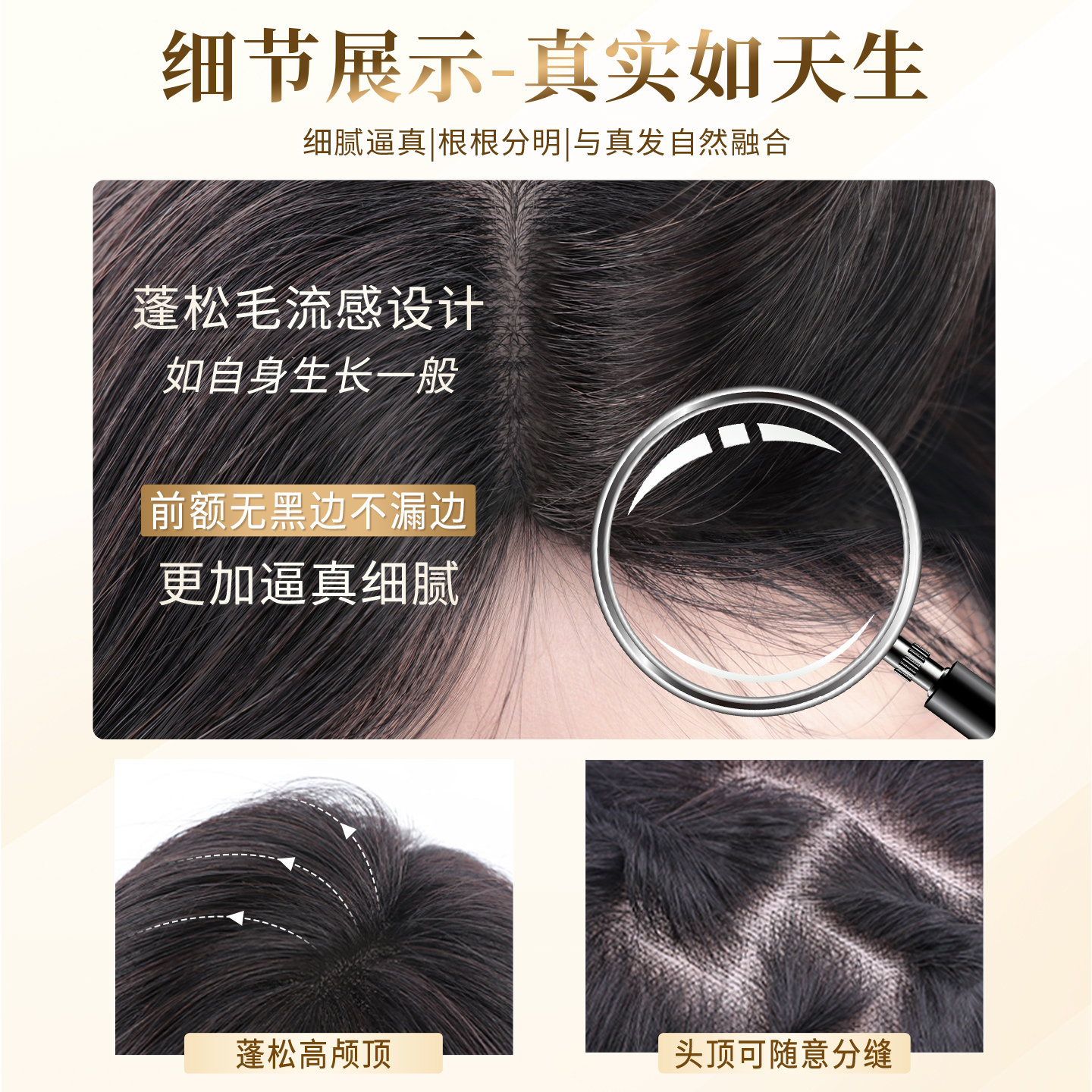 无需发卡魔术贴假发女片头顶补发蓬松颅顶自然前额真发刘海补发片