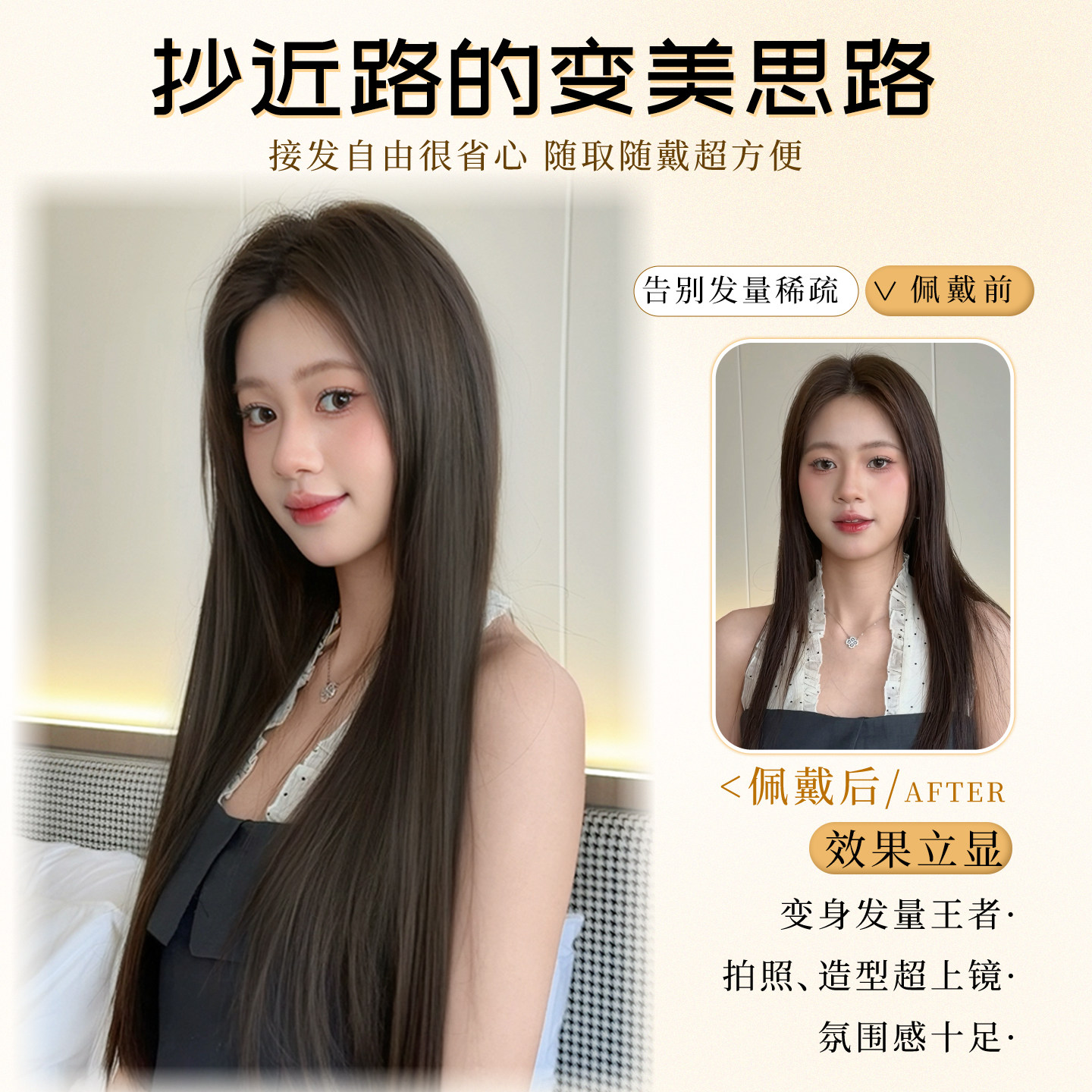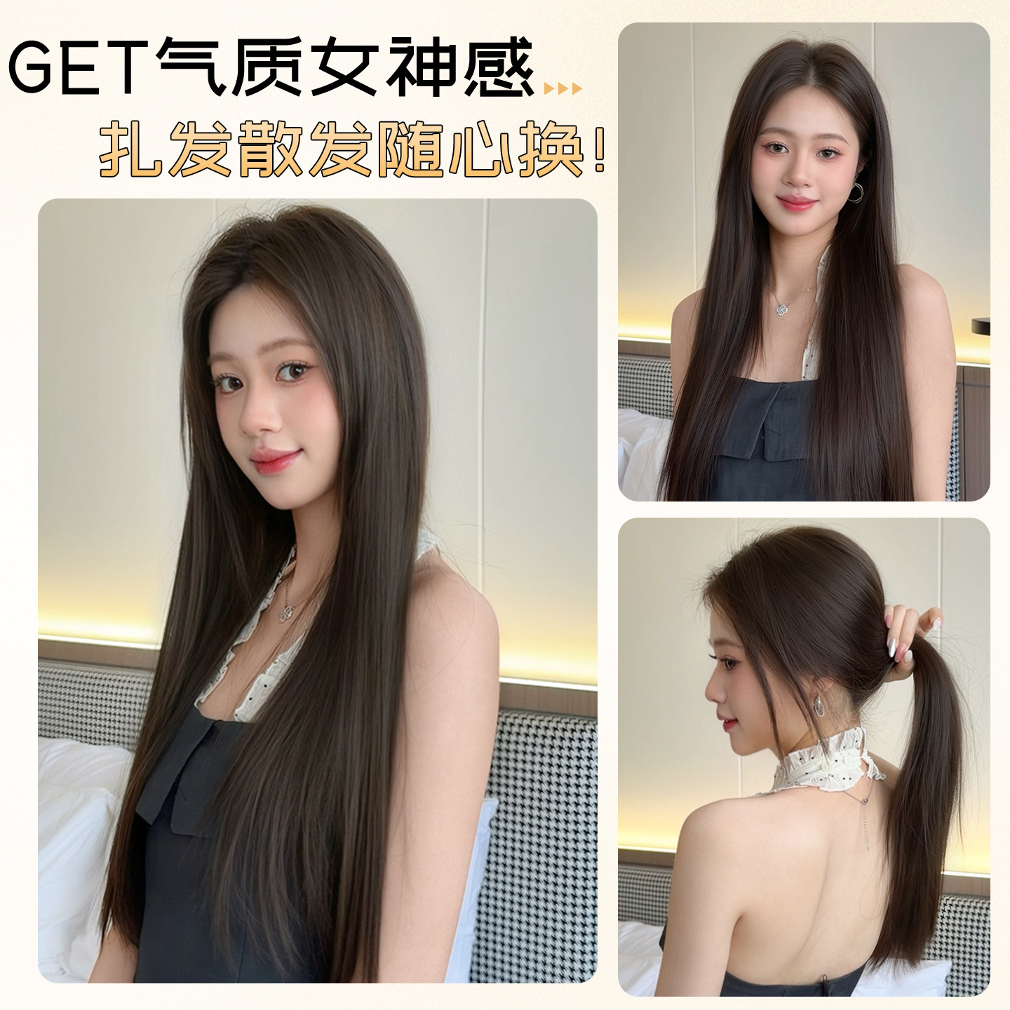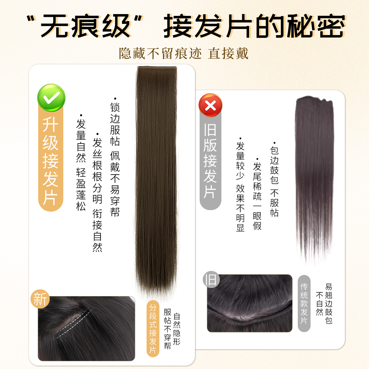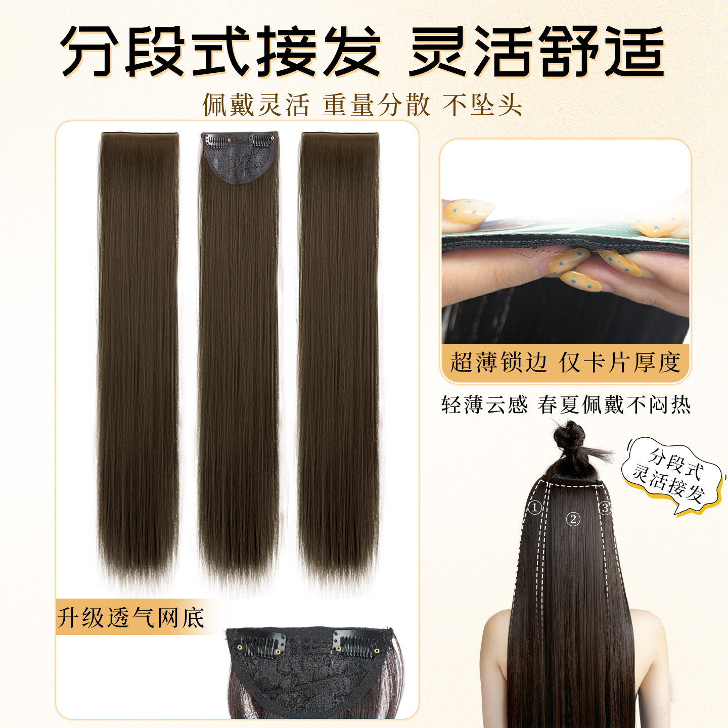 这款女式三片式隐形无痕仿真发假发片,专为增发量、补发缝和打造丰盈发型而设计。采用优质高温丝或真人发丝制作,触感柔顺,光泽自然,完美贴合头皮。三片式结构可灵活分区佩戴,轻松覆盖头顶稀疏区域,隐形无痕设计让佩戴后毫无破绽。一片式长直发造型简约大方,适合日常、职场或特殊场合。接发贴片采用医用级粘胶或夹子固定,牢固舒适,不伤真发。操作简单,无需专业技巧,几分钟即可实现发量倍增,瞬间提升自信与气质。是发量少、产后脱发或追求多变造型的女性理想之选。