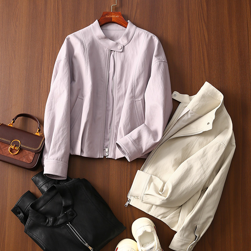 天MSLAN纸感皮衣 26春时尚立领机车黑色皮衣短款廓形显瘦夹克外套女