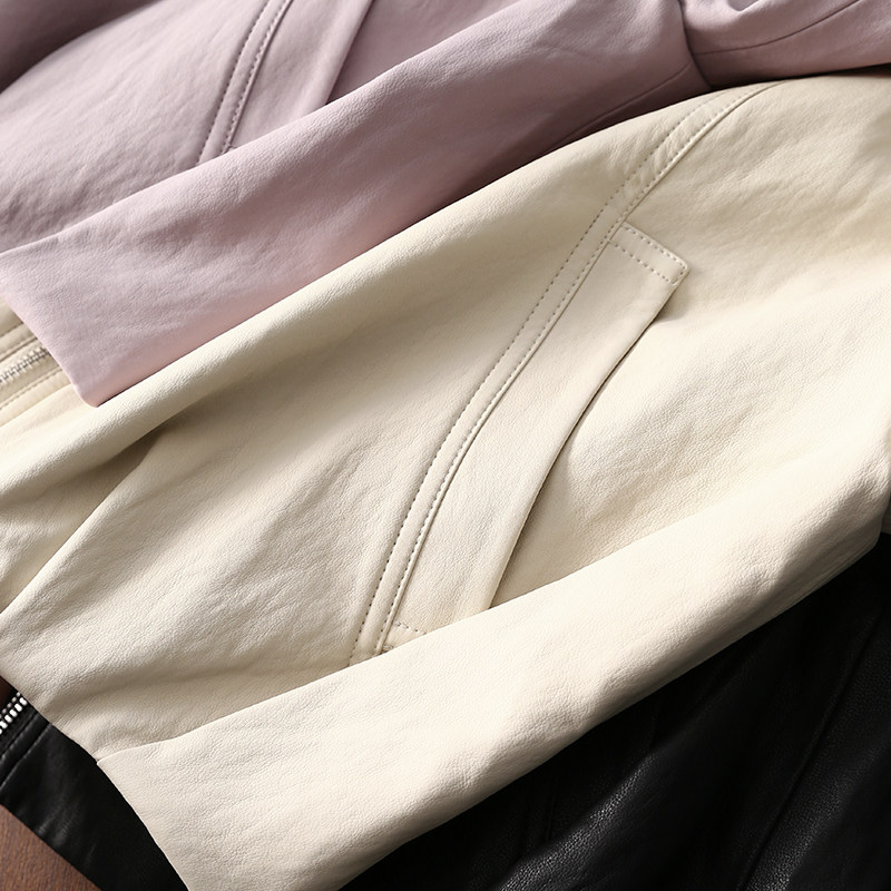 D16066日单新款客供料翻边毛毛领可拆宽松女纯色休闲PU皮衣外套
