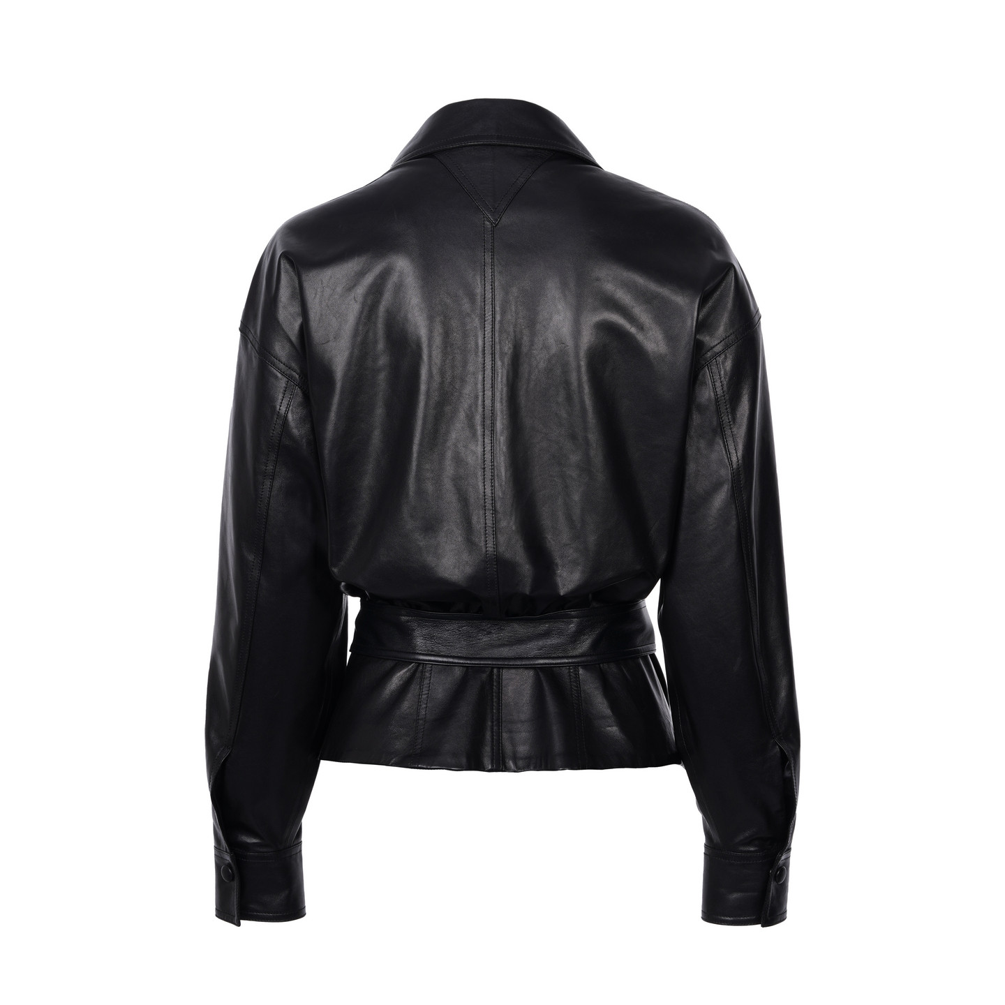 天猫LYNEE【金标 D奥小姐】黑色V领羊皮真皮皮衣女收腰系带PU皮外套