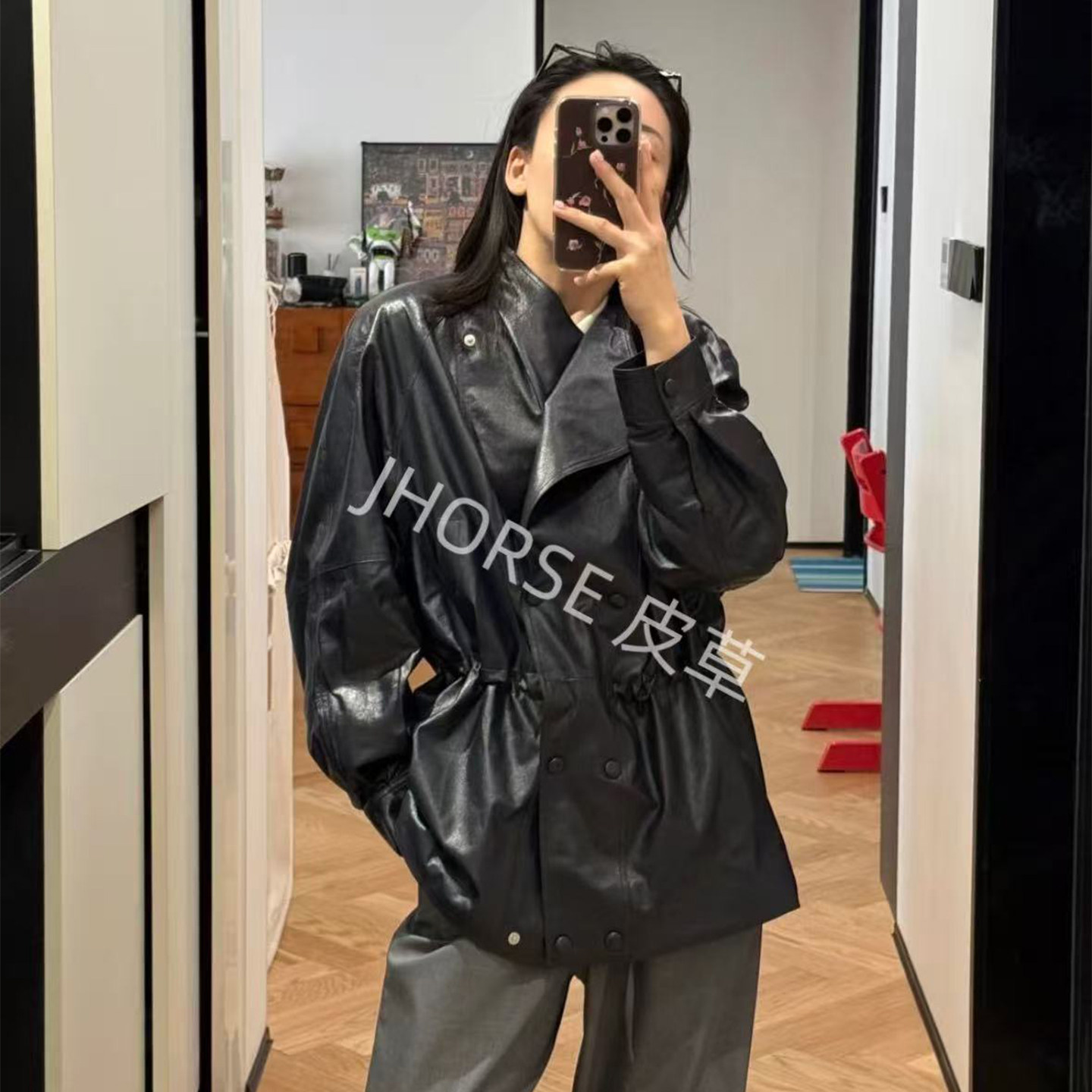 淘宝进口超薄全植鞣油蜡皮2026春抽绳宽松收腰真皮皮衣女绵羊皮外套