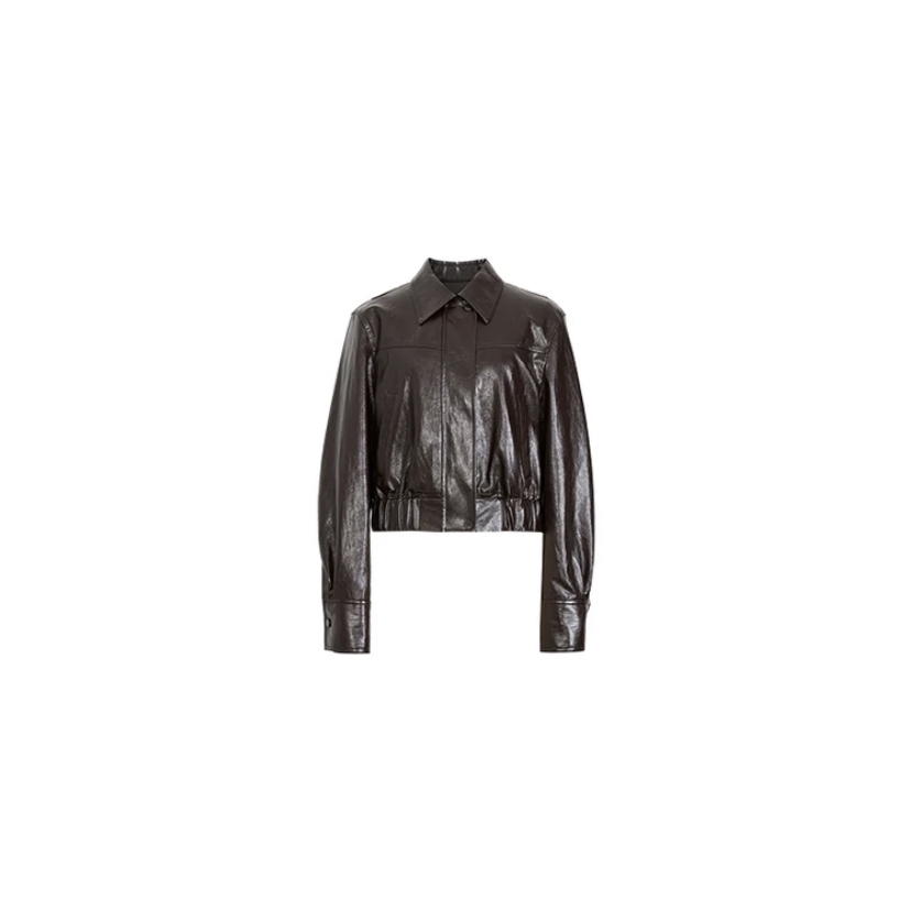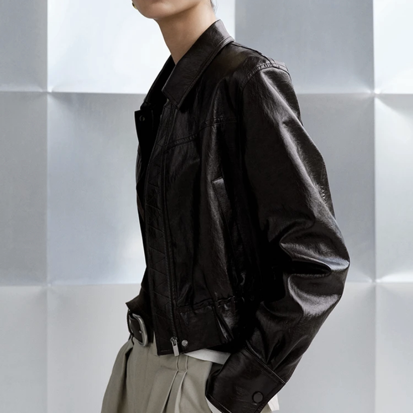 MSLAN纸感皮衣 26春时尚立领机车黑色皮衣短款廓形显瘦夹克外套女
