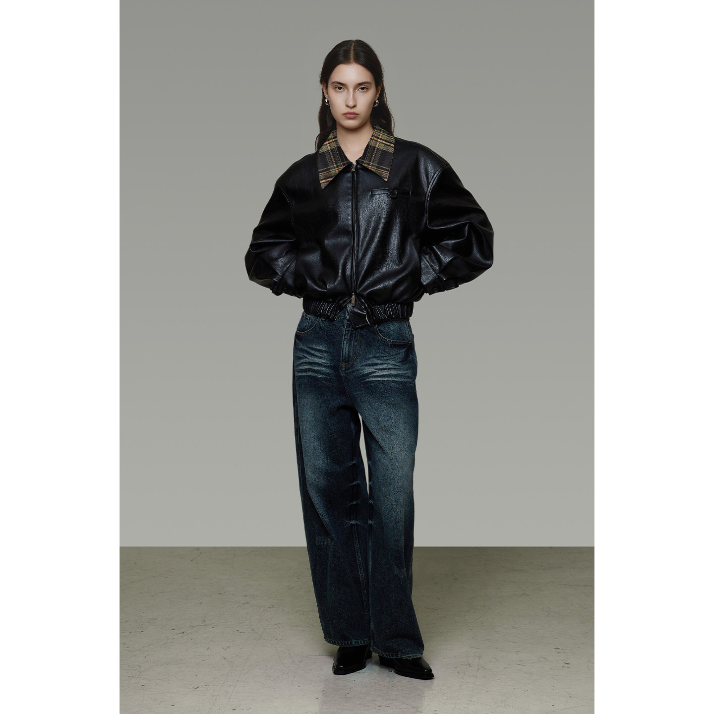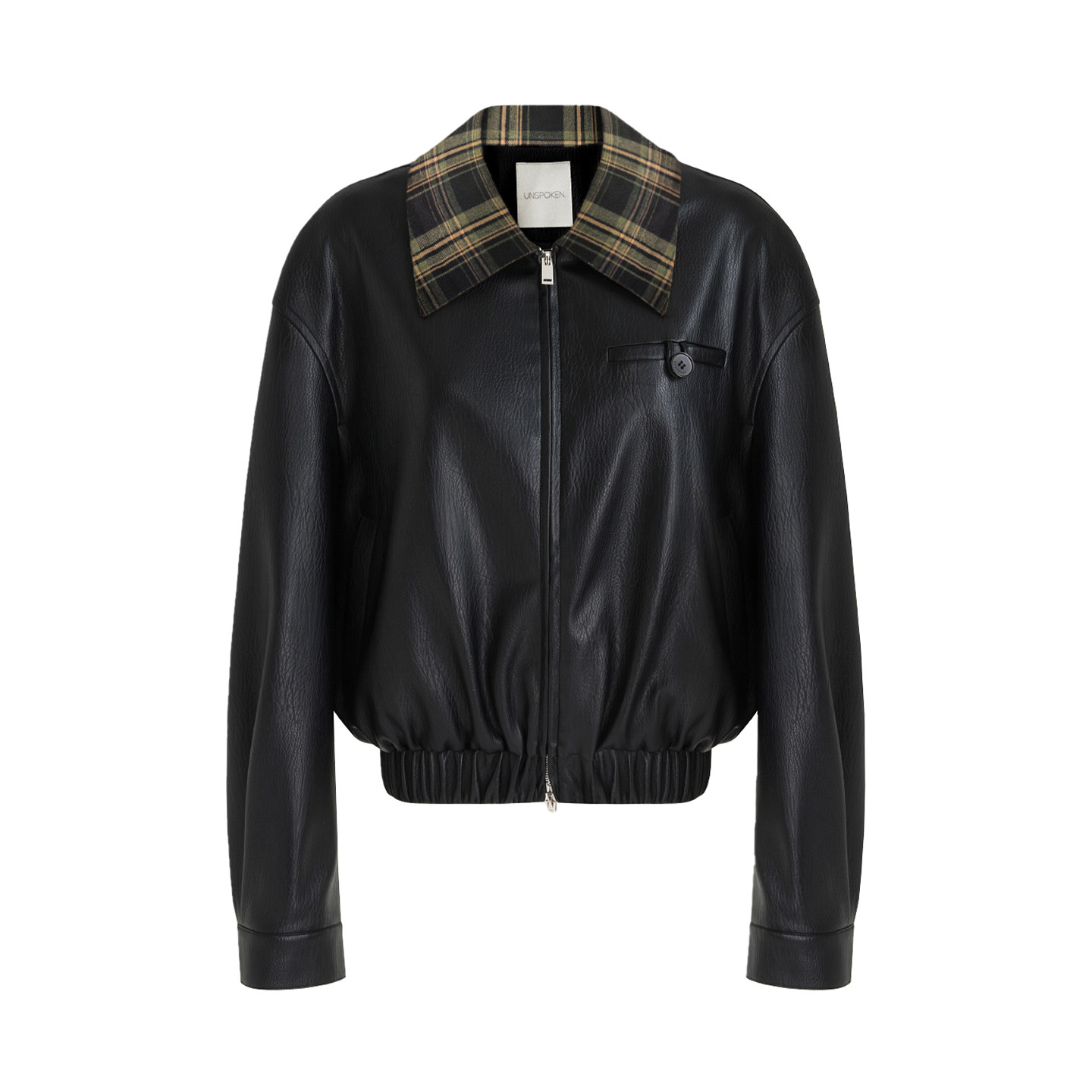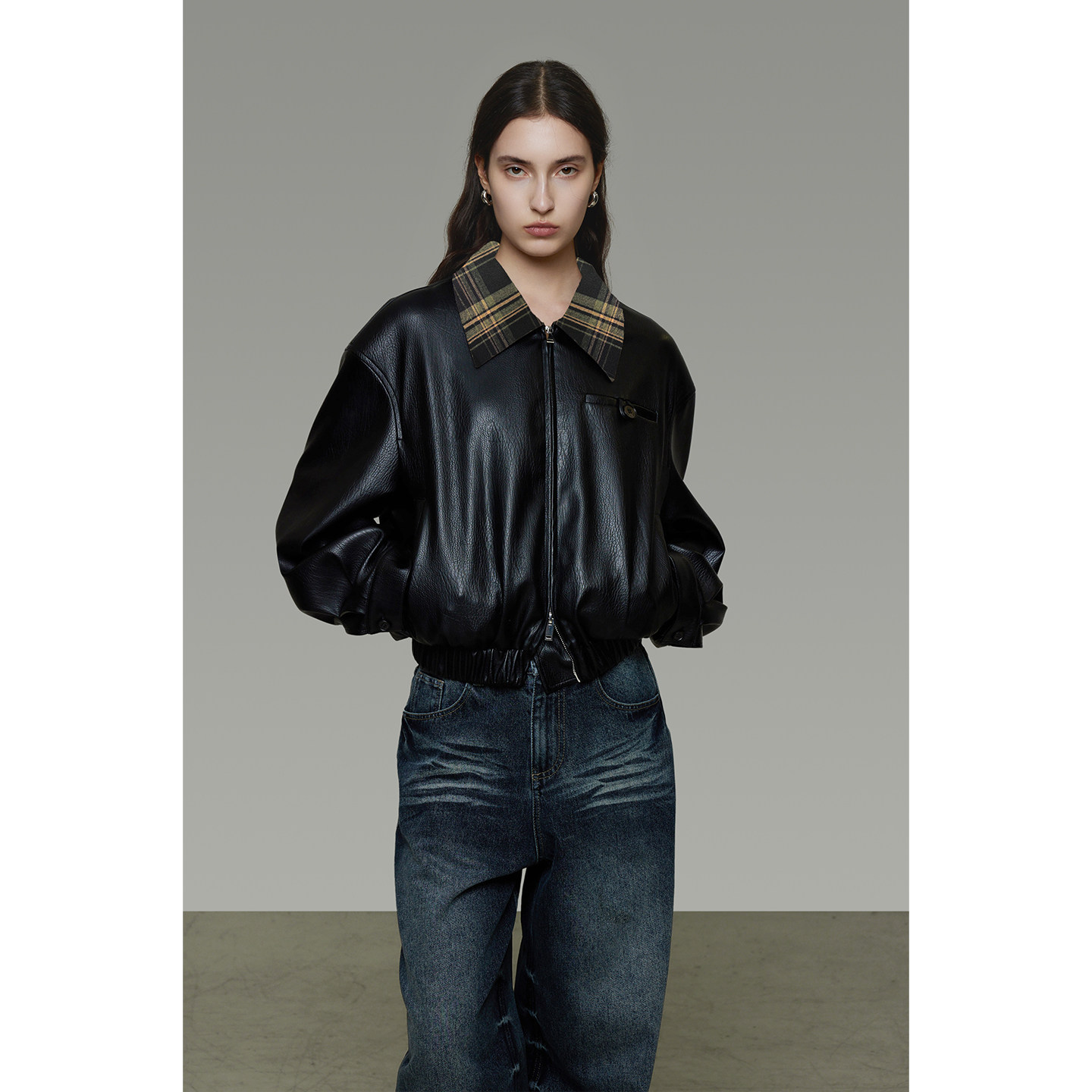 淘宝UNSPOKEN经典格纹拼接翻领皮衣外套女春季宽松设计感短款机车夹克