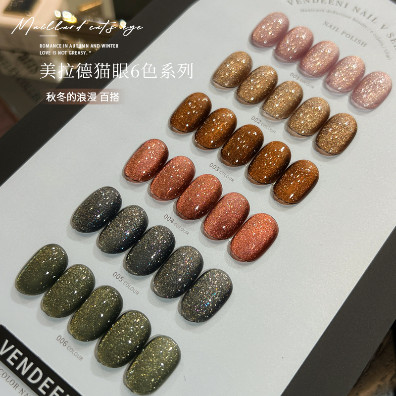淘宝VDN2025年新款甲油胶秋季美拉德猫眼爆闪6色碎钻美甲店小套系