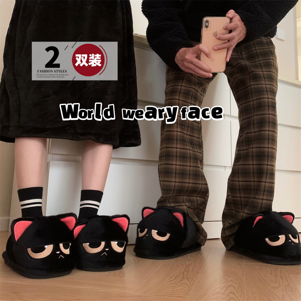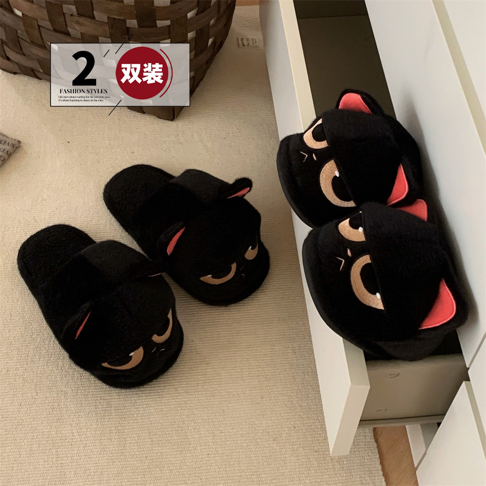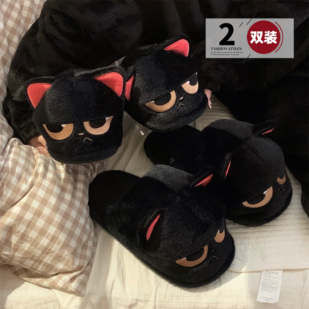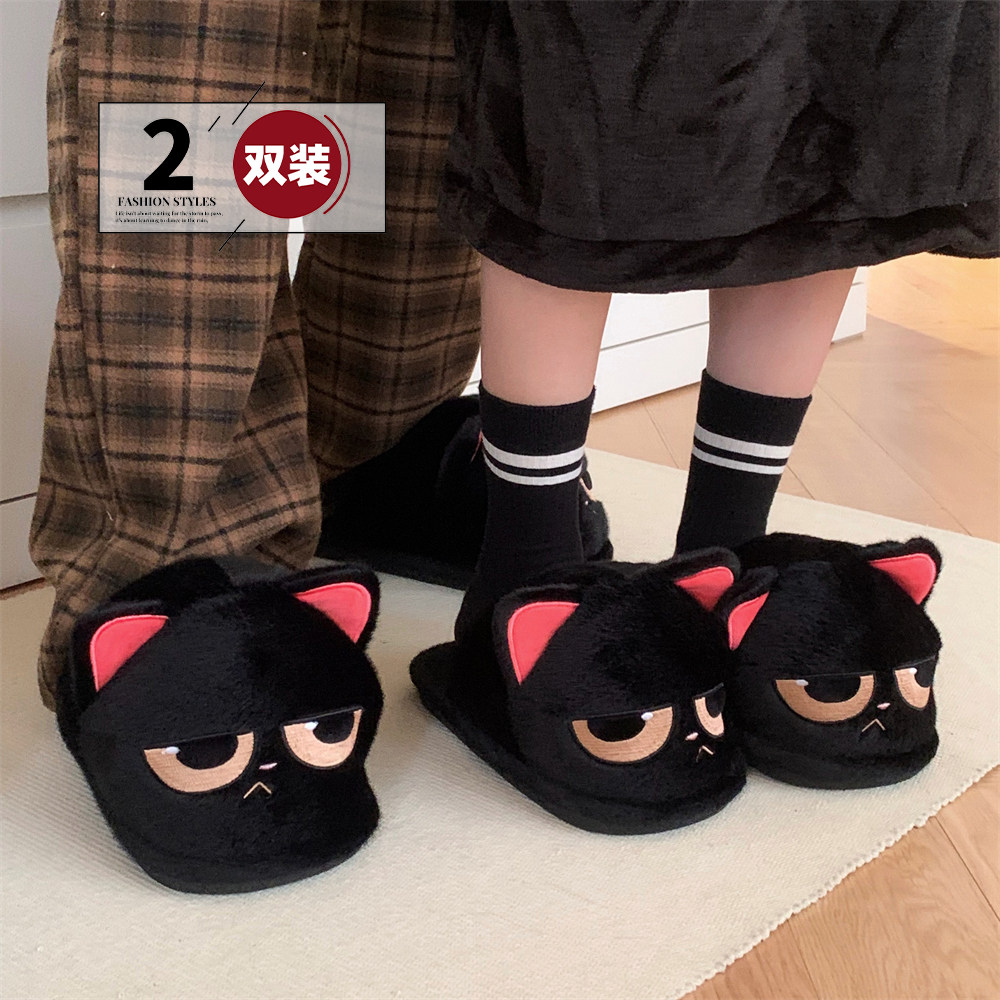 淘宝细细条 两双装趣味毛毛鞋男女ins可爱小黑猫情侣秋冬季居家棉拖鞋