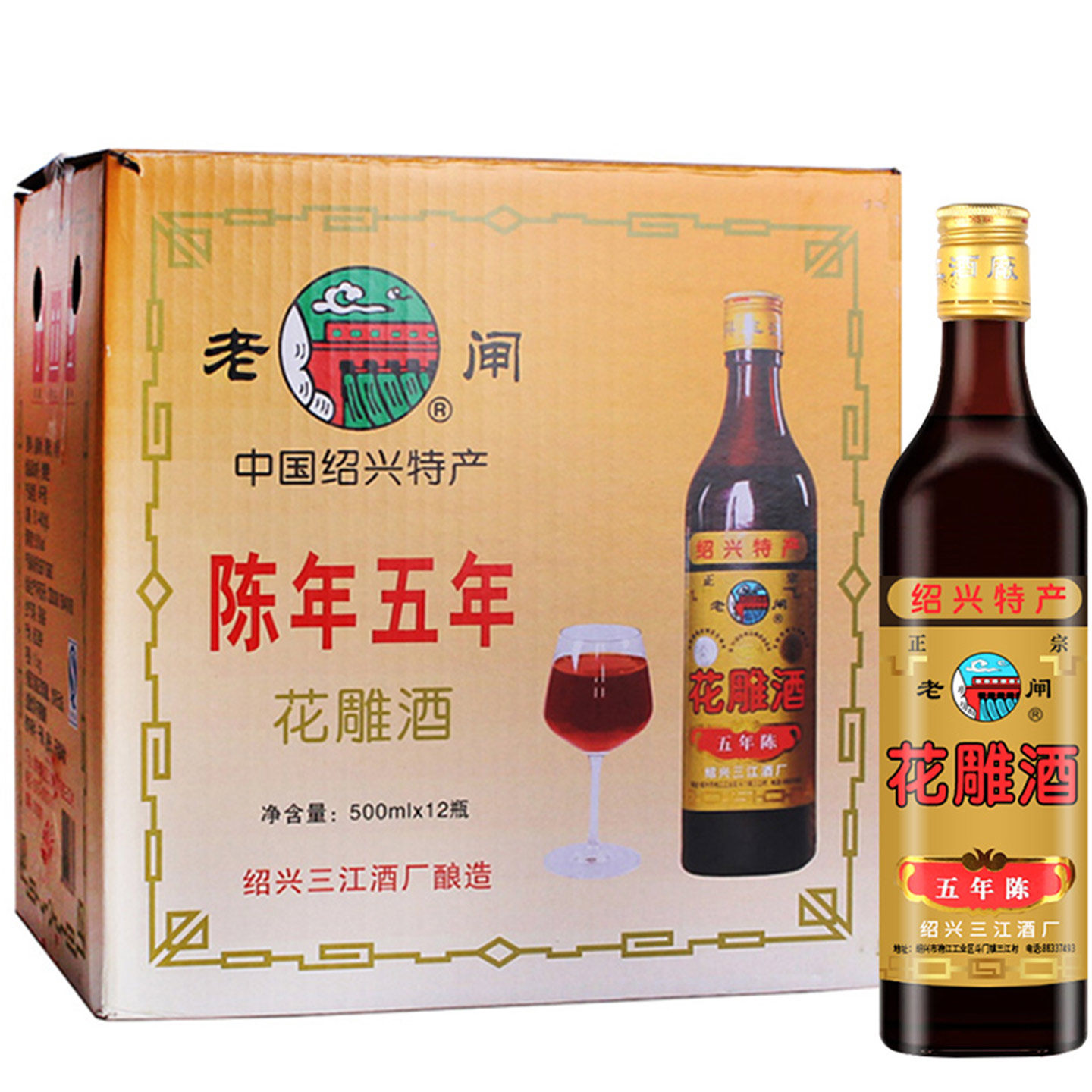 天猫绍兴特产黄酒 老闸五年陈手工糯米加饭花雕酒 500毫升*12瓶整箱装