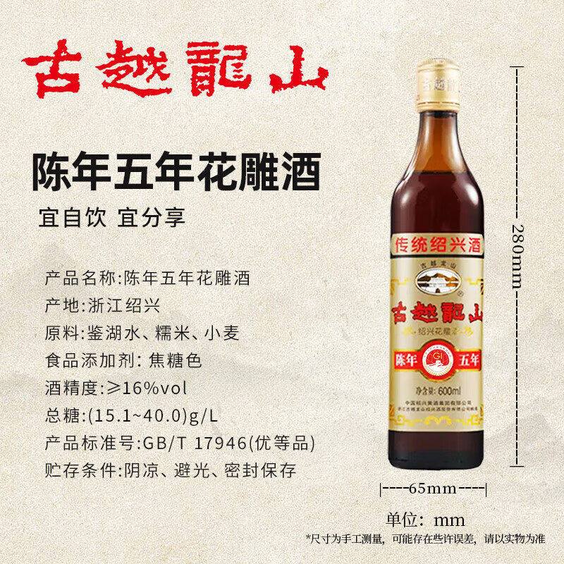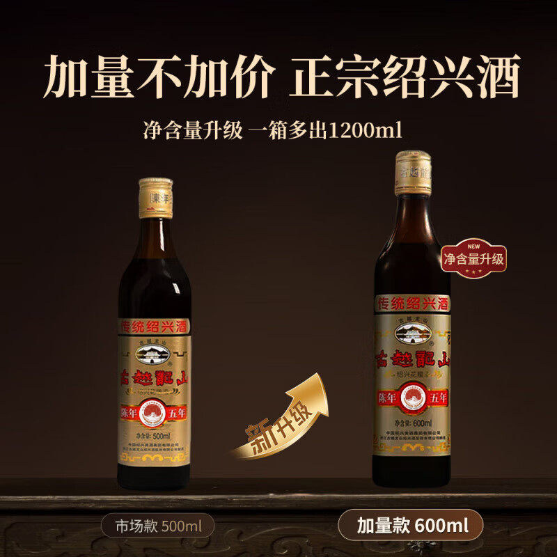 天猫古越龙山绍兴黄酒陈年五年600ml*2瓶装花雕酒厨用料酒绍兴老酒