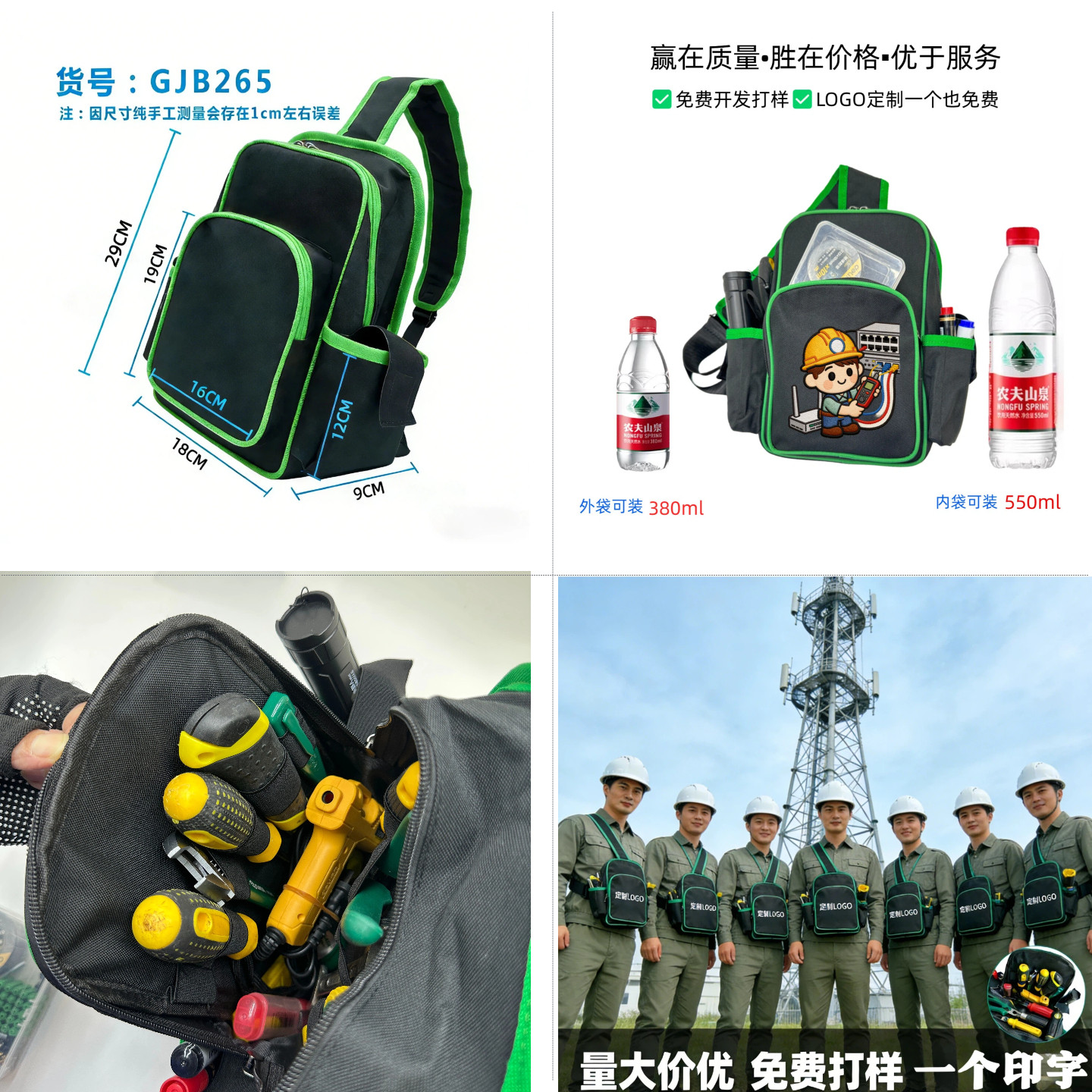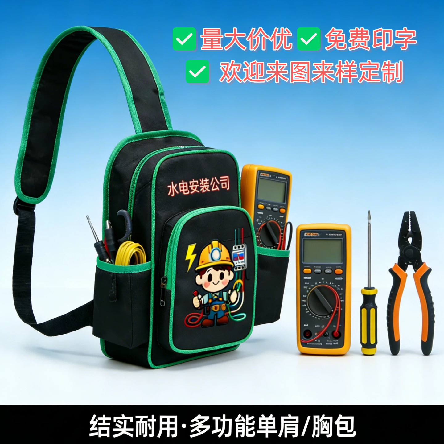 这款电工工具胸包专为电工师傅设计,采用高强度耐磨面料,结实耐用,抗撕裂、防泼水。包身设有多功能分层口袋,合理分区,轻松收纳螺丝刀、钳子、电笔等常用工具;特别配备万用表专用固定位,稳固安全,取用便捷。小号轻便设计,不占空间,搭配可调节单肩背带,可斜跨或胸背,解放双手,提升作业效率。无论是日常检修、设备安装还是户外作业,都能轻松应对。人性化设计兼顾实用性与舒适性,是电工、维修人员理想的随身工具伴侣,真正实现“一包在手,工具我有”。