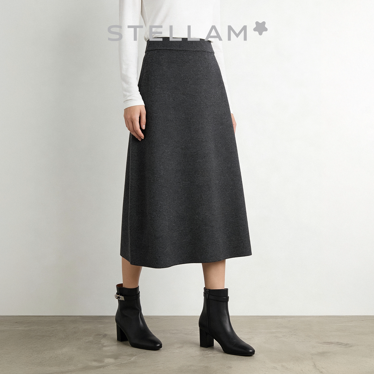 天猫STELLAM女装100%羊毛针织半身裙女 极简垂坠慵懒 优雅中长裙-MALA