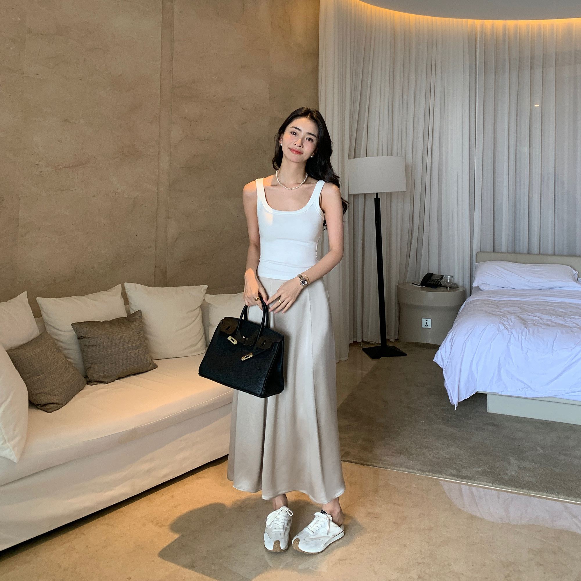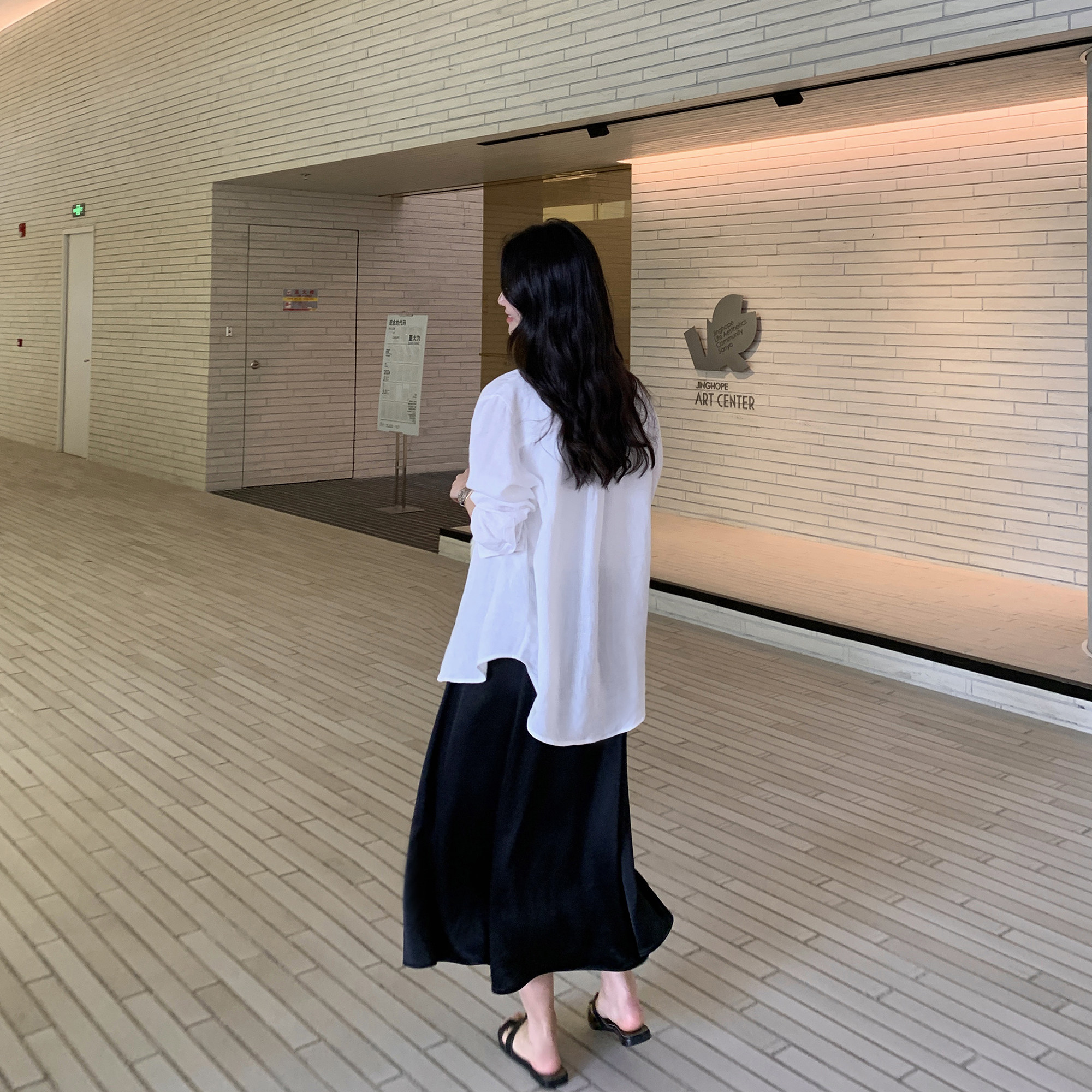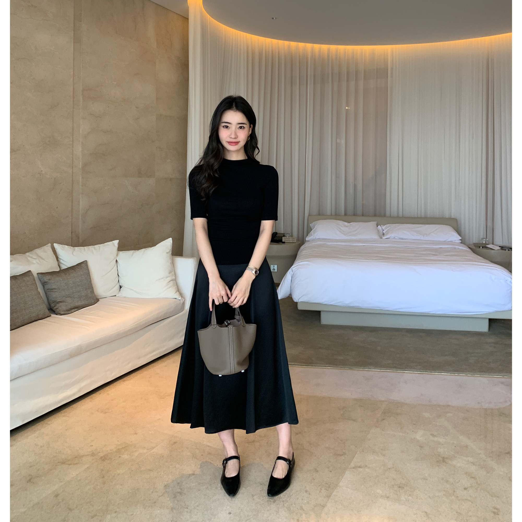 淘宝Maven Lin 高级感气质黑色醋酸半身裙女新款缎面A字中长款伞裙