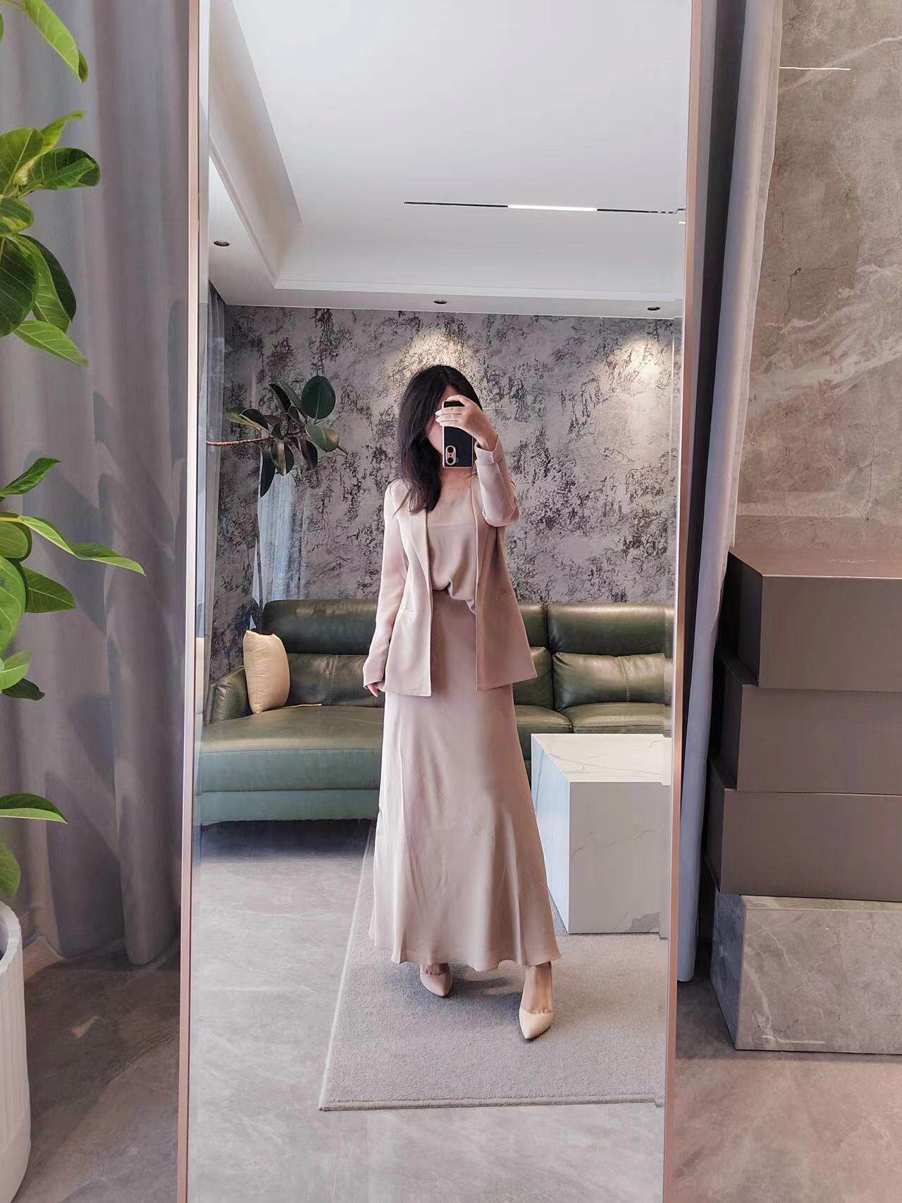 现货供应23MM鬼绉绉面料套装,含夹克上衣、半身裙及A型版吊带三件套,提供两种经典配色可选。上衣采用挺括有型的夹克剪裁,结合独特鬼绉绉肌理,垂坠感强且富有层次;搭配同材质高腰A字半身裙,修饰身形,优雅显瘦;内搭A型吊带,简约贴身,提升穿搭舒适度与整体协调性。整体设计兼具时尚感与实穿性,适合日常通勤、休闲聚会等多种场合。面料轻盈透气,触感柔滑,四季皆宜。现款现货,快速发货,是打造高级感穿搭的理想选择。