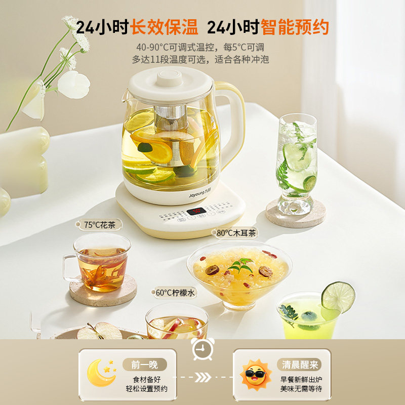 九阳2025新款养生壶,2L大容量设计,满足家庭、办公室多人使用需求。集煮茶、炖汤、烧水、保温等多功能于一体,智能触控面板搭配多段温控系统,精准掌控火候,轻松应对花茶、养生粥、银耳羹等多种食材。高硼硅玻璃壶身耐高温、易清洁,搭配304不锈钢发热盘,安全耐用。内置滤网设计,茶汤分离更纯净。支持12小时预约与自动保温功能,便捷省心。简约时尚外观,适配现代家居与办公环境,是追求健康品质生活的理想之选。九阳品质保障,让每一壶都安心享用。