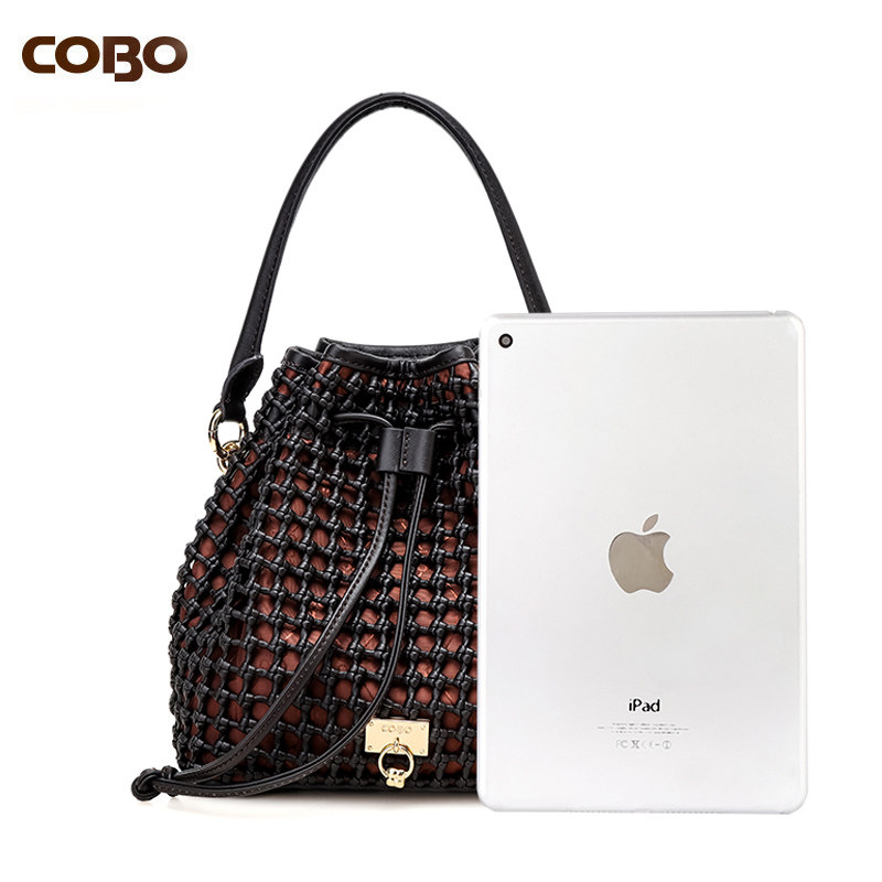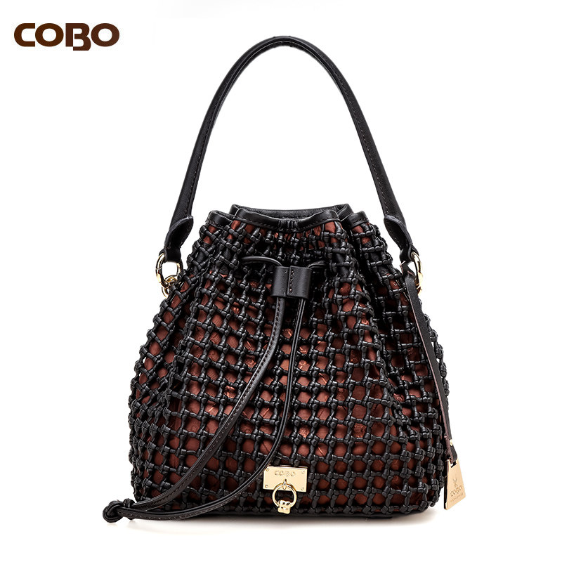 天猫COBO/蔻尔宝头层牛皮手工编织手提单肩斜挎时尚休闲水桶包