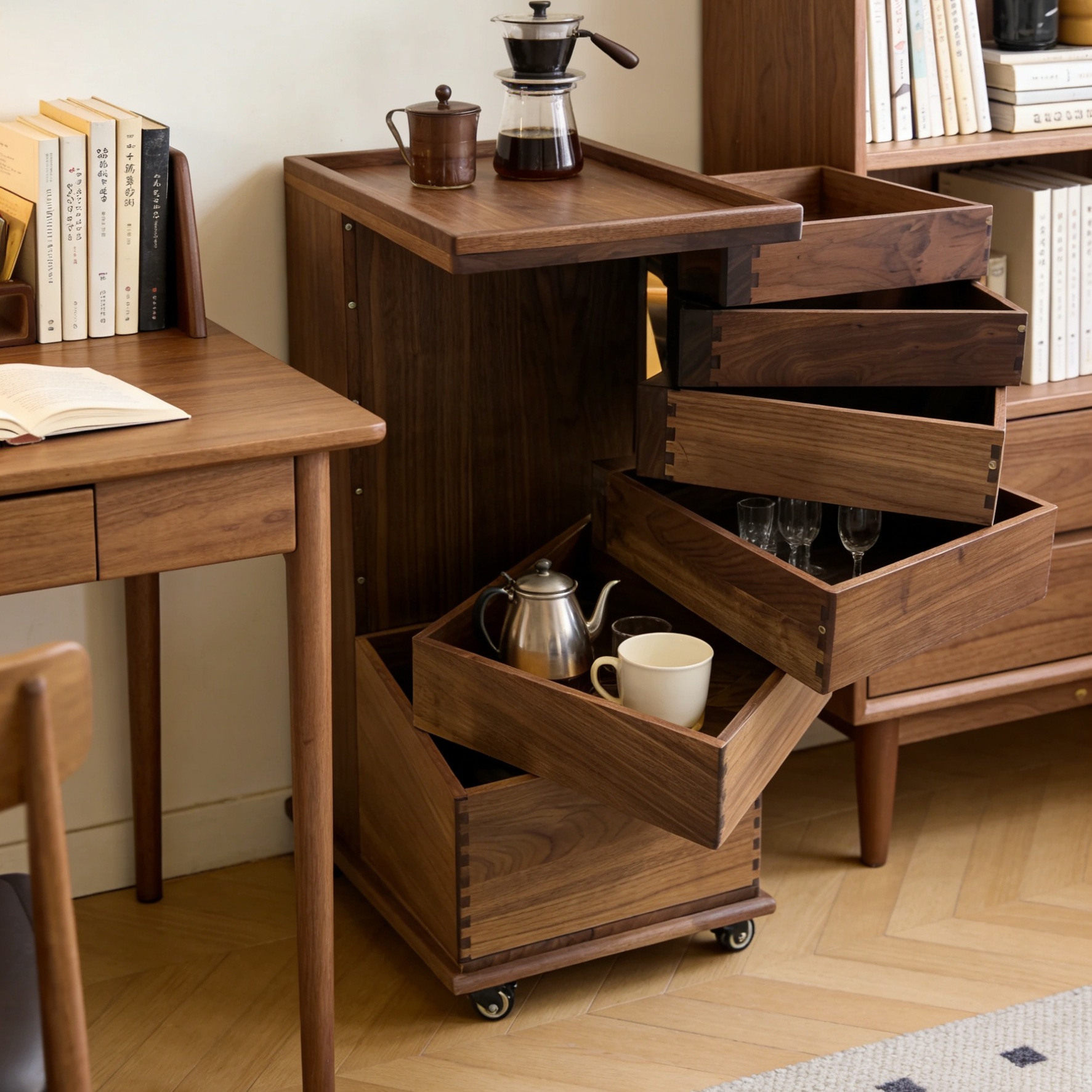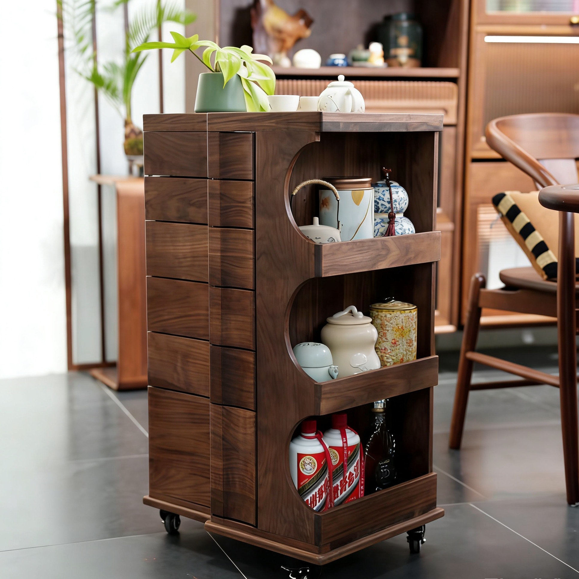 这款北美黑胡桃实木带轮移动多功能旋转抽屉收纳柜(50×38×80cm),精选优质北美黑胡桃木打造,纹理细腻、质感温润,兼具美观与耐用性。柜体结构稳固,配备多层旋转抽屉与开放式储物格,灵活分类收纳衣物、书籍、办公用品等,空间利用率高。底部配置静音万向轮,移动轻松便捷,可自由旋转定位,适应客厅、卧室、书房等多种场景。简约现代设计融合天然木色,彰显高雅品味,既是实用收纳家具,也是提升家居格调的艺术单品。环保涂装工艺,安全无异味,为您打造健康舒适的生活空间。