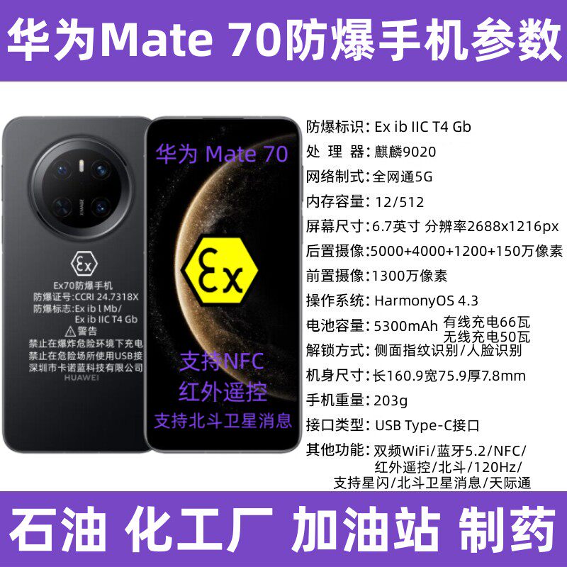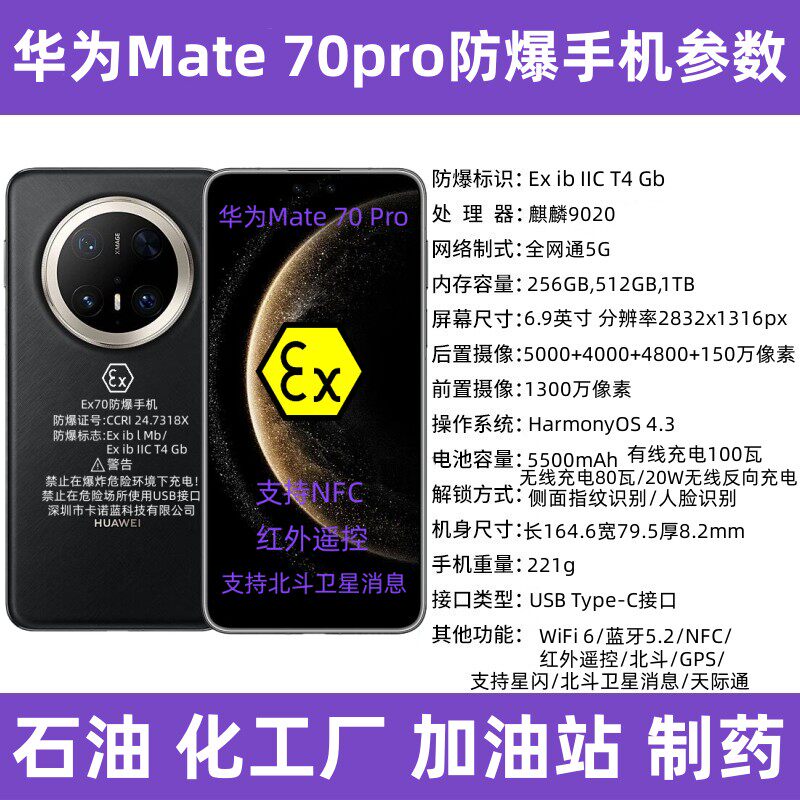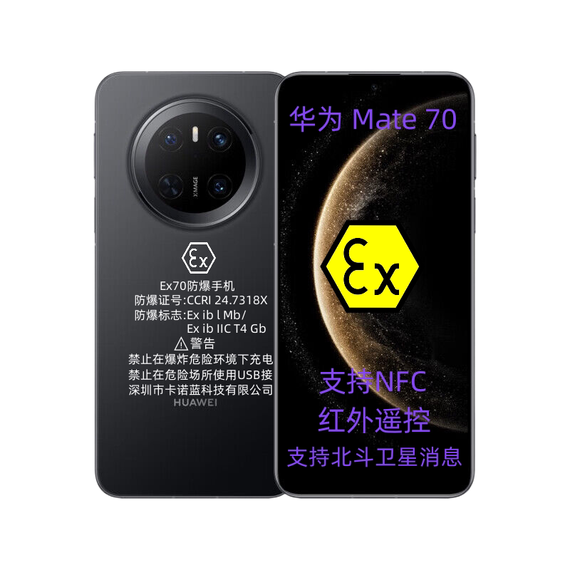 华为Mate70 Pro防爆手机是一款专为化工、石油、制药等高危环境设计的本安型5G智能终端,通过国家防爆认证(Ex认证),具备卓越的防爆、防尘、防水性能(IP68)。搭载高性能5G芯片,支持高速数据传输与低延迟通信,确保现场作业高效安全。集成NFC功能,便于巡检打卡与设备识别;配备红外遥控模块,可远程操控工业设备;支持智能巡检系统,实现数据实时上传与隐患预警。其坚固机身与长续航设计,适应恶劣工况,是工业智能化升级的重要工具,助力企业提升安全生产与运维效率。