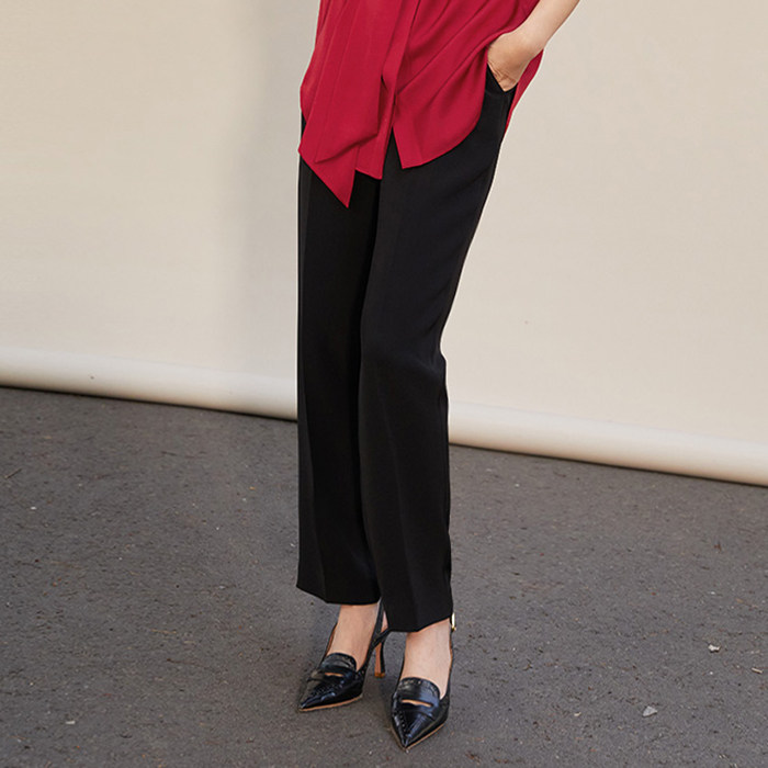 #WXZ05034茉莉雅集高姆米奢华40姆米重绉全真丝西装直筒裤,甄选40姆米重磅真丝面料,质感垂坠,光泽柔润,尽显高级质感。采用经典直筒剪裁,线条利落,修饰腿型,兼具优雅与干练。重绉工艺赋予面料自然肌理与良好回弹性,穿着舒适挺括,不易变形。无论是搭配真丝衬衫出席正式场合,还是搭配简约上衣日常通勤,皆能展现从容气度。茉莉雅集以匠心工艺诠释东方美学,将奢华材质与实用设计完美融合,成就一件值得珍藏的时尚单品,彰显穿着者不凡品味与独特格调。