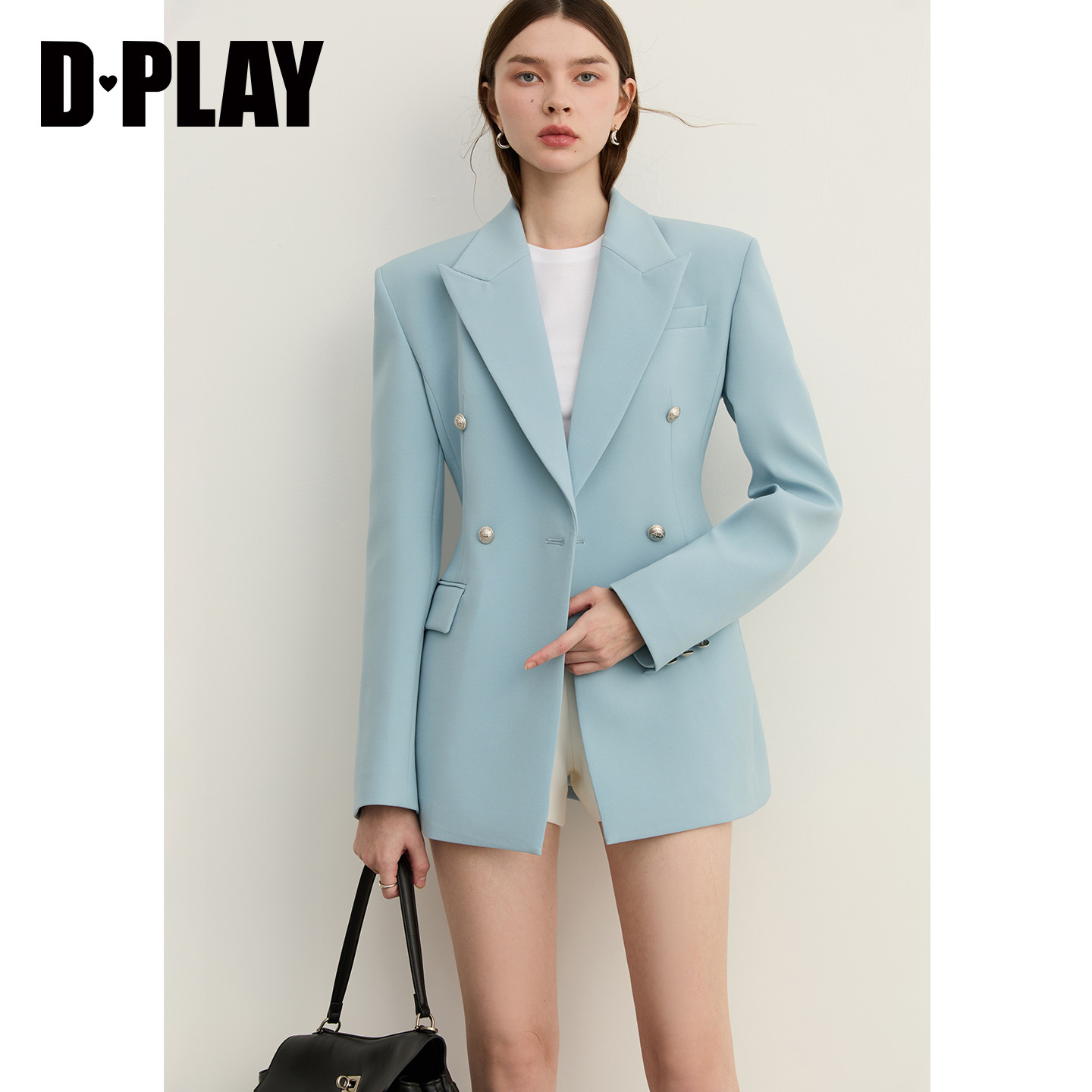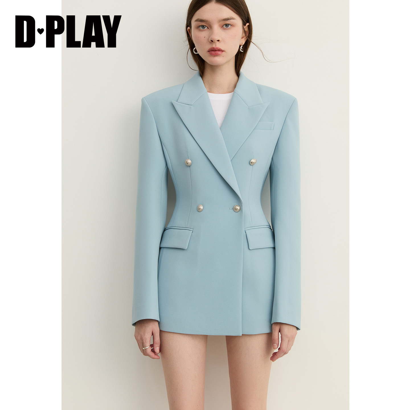 DPLAY 2026年春季新款蓝色翻领双排扣西装外套,以优雅剪裁与现代通勤美学完美融合。采用高品质挺括面料,利落线条勾勒出修身版型,收腰设计凸显女性曼妙身姿,兼顾干练与柔美。经典双排扣搭配精致翻领,细节处彰显高级质感,深邃蓝色调沉稳而不失时尚感,轻松驾驭职场与日常穿搭。无论是搭配衬衫、连衣裙或高腰裤,皆能展现自信从容的气质。这款外套集实用性与设计感于一身,是都市女性打造知性优雅风格的理想之选,为春日衣橱注入一抹亮眼风采。