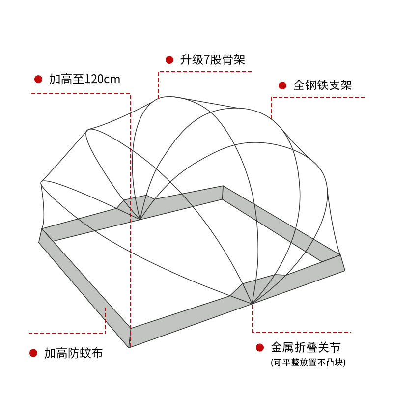 A类加密TU型床笠式回底防摔蚊帐家用3开门全封闭拉链方帐加厚支架