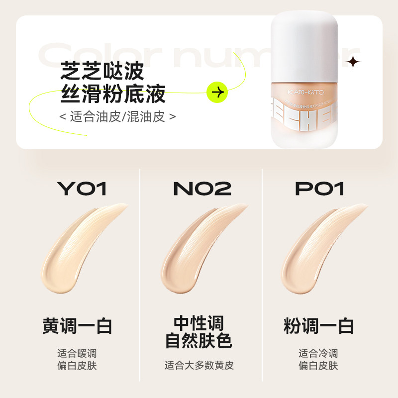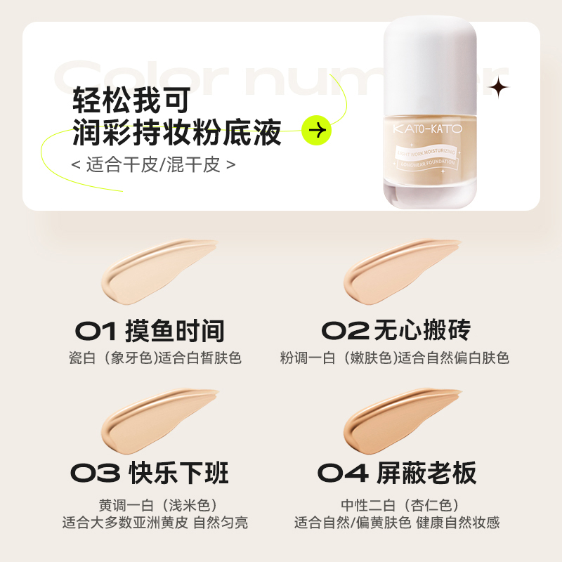 KATO粉底液是一款专为学生党设计的平价养肤型底妆产品,适合干皮、混油皮等多种肤质。它集控油、遮瑕、保湿于一体,质地轻薄服帖,上脸自然不假面,有效修饰毛孔与瑕疵,呈现清透奶油肌妆效。添加养肤成分,温和不刺激,长时间带妆也不易闷痘。持久力强,抗汗抗油,不易脱妆斑驳,满足日常上课或外出需求。同时具备BB霜的便捷性,一瓶多效,简化护肤步骤。价格亲民,性价比高,是追求自然妆感与肌肤呵护的年轻女生的理想选择,轻松打造全天候精致底妆。
