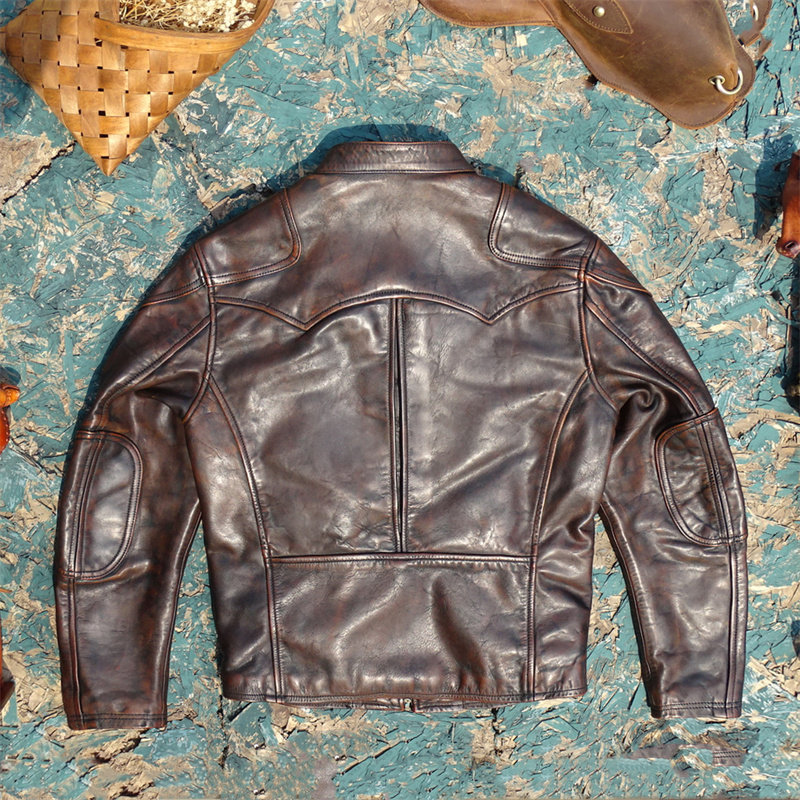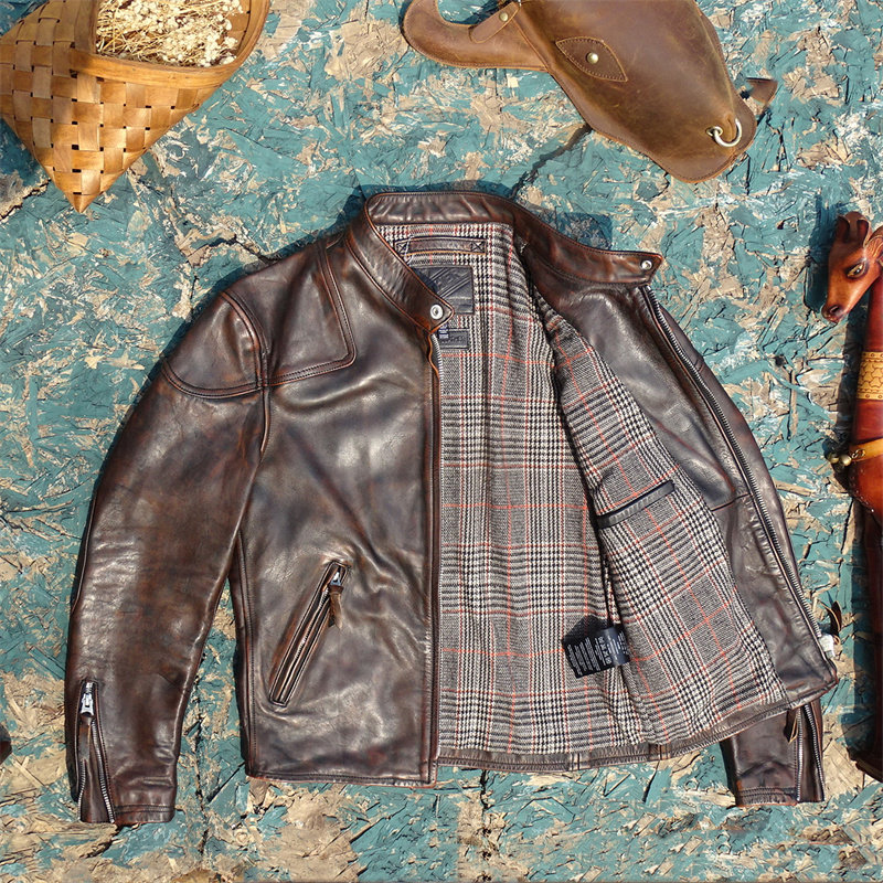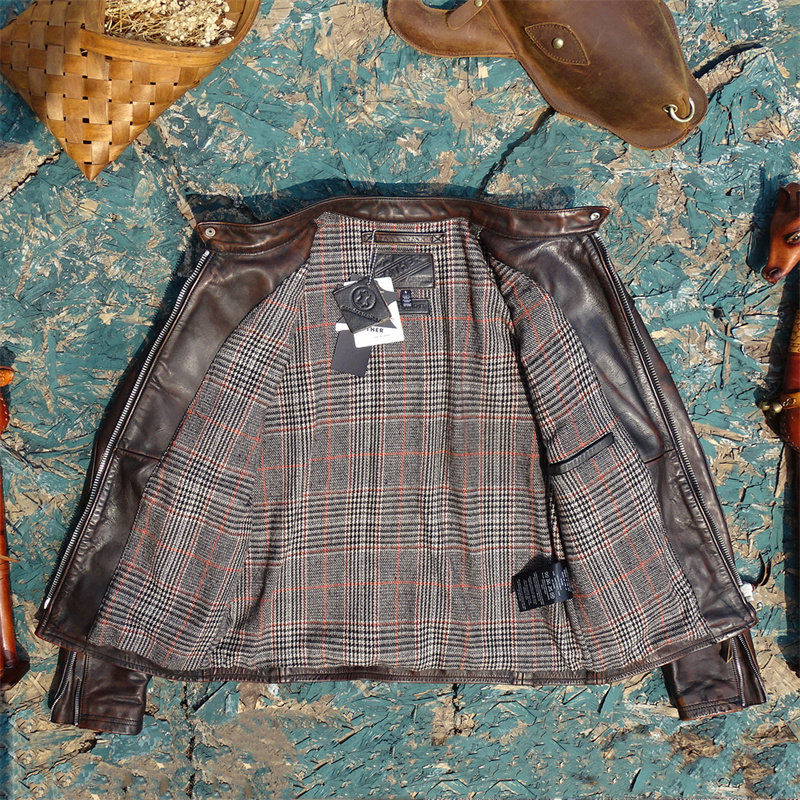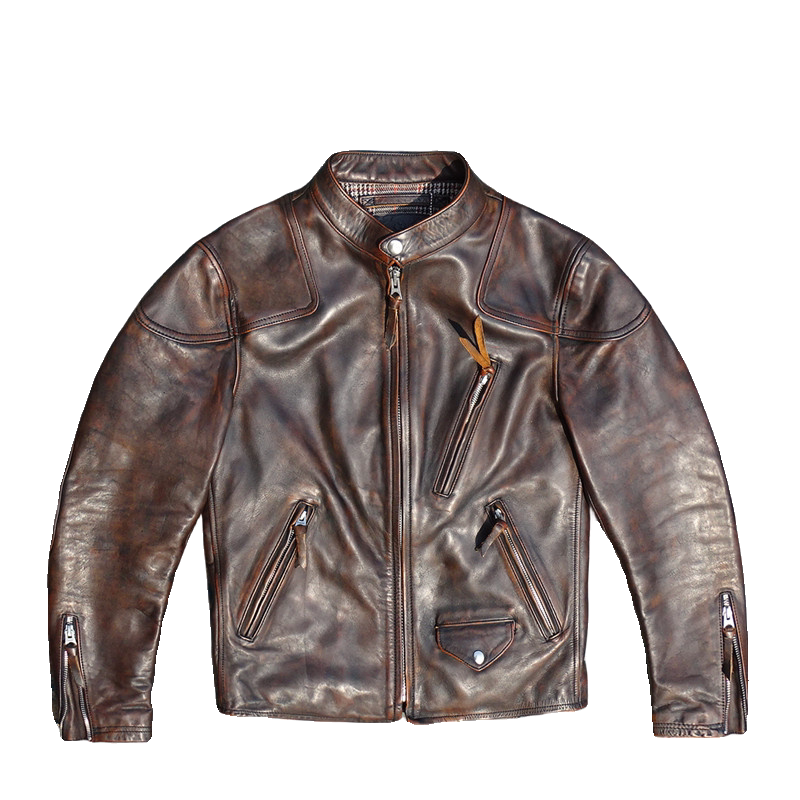 淘宝美式经典进口头层黄茶芯擦色做旧马皮真皮皮衣男毒液款立领修身男