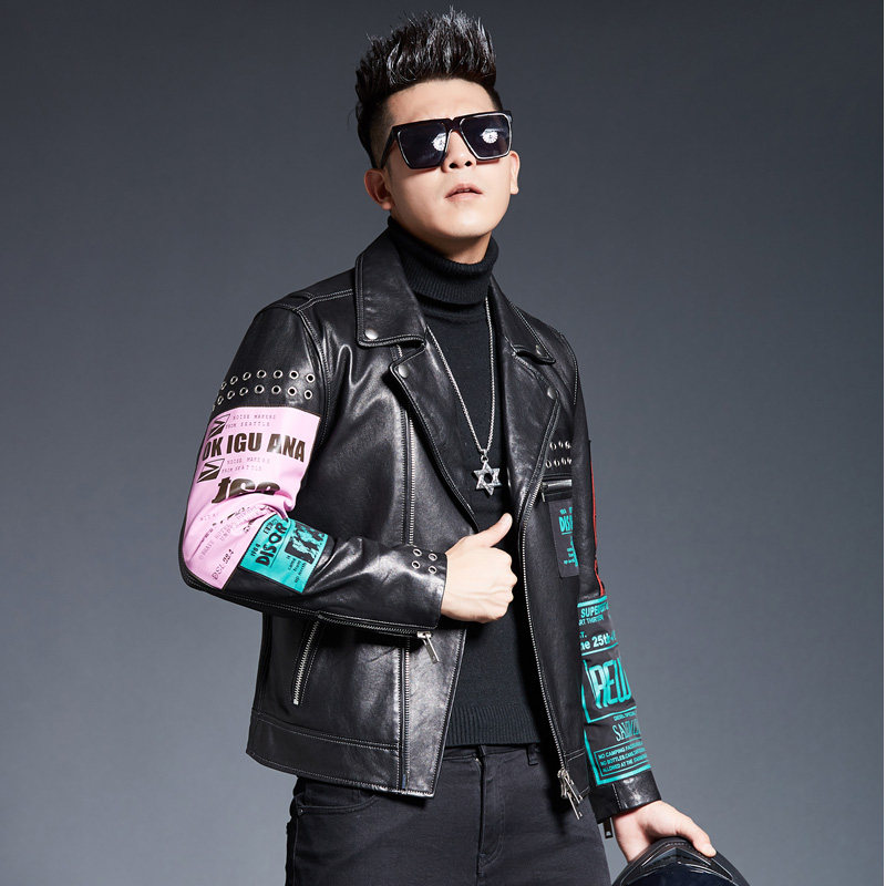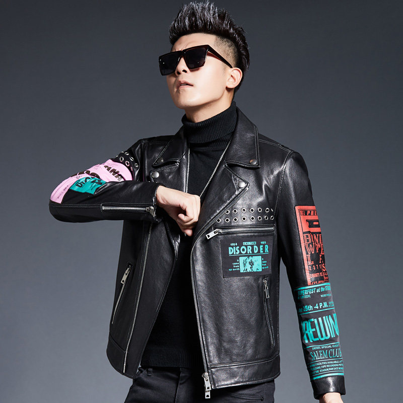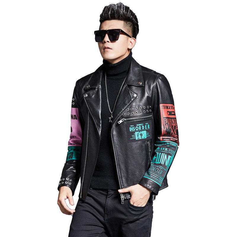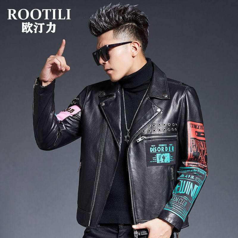 天猫男士真皮皮衣山羊皮海宁皮夹克短款哈雷修身机车印花潮男薄外套