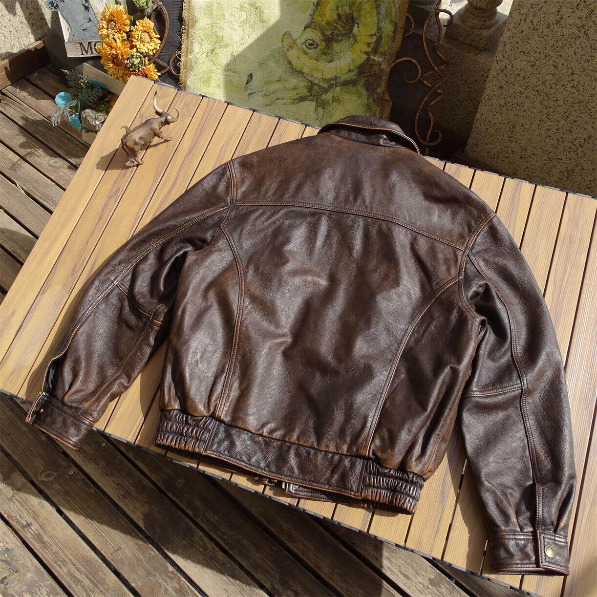 淘宝经典港风阔版头层牛皮真皮夹克男手工擦色宽松加大码飞行服皮衣