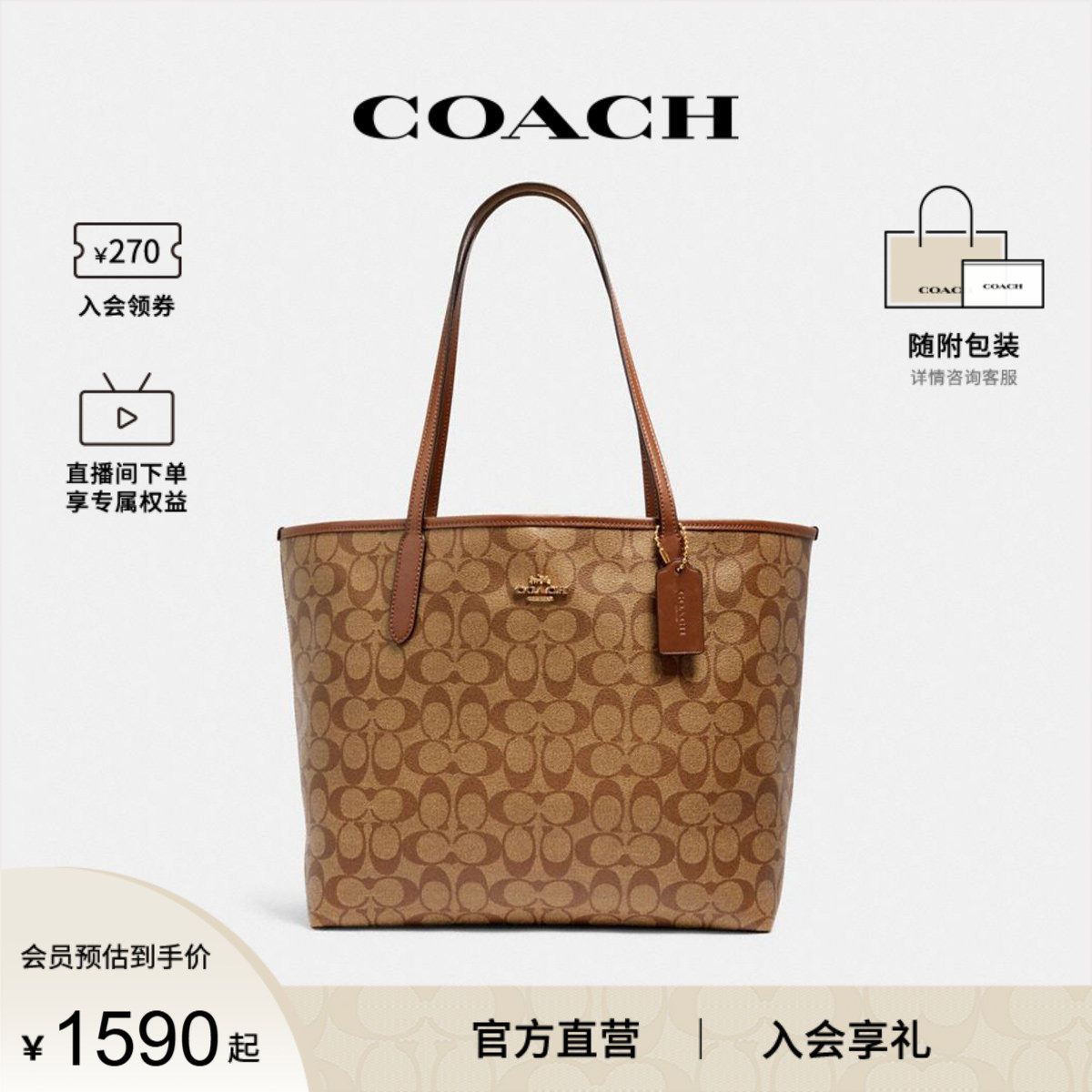 天猫COACH/蔻驰官方 奥莱女士city33通勤大号老花单肩手提托特包5696