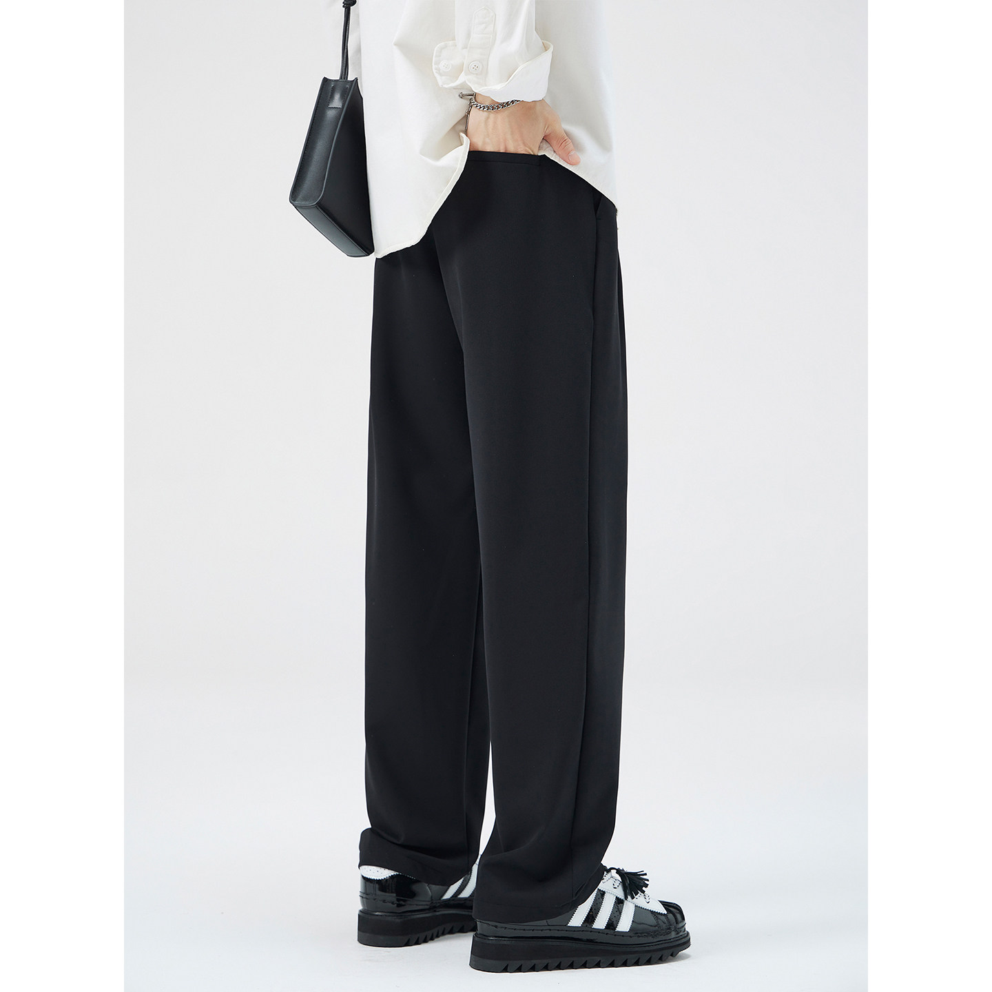 吾一白春夏薄款新款男士休闲西裤,采用优质冰丝面料,轻盈透气,垂感自然,带来清爽舒适的穿着体验。宽松直筒版型设计,修饰腿型,活动自如,兼具时尚与实穿性。经典黑色百搭不挑人,轻松搭配衬衫、T恤或 Polo 衫,适用于通勤、休闲、约会等多种场合。高腰设计提升腰线,视觉更显修长。精致车线工艺,细节考究,彰显品质感。无论是夏日出行还是日常穿搭,这款西裤都能为你增添简约而不简单的型男魅力,是男士衣橱不可或缺的时尚单品。