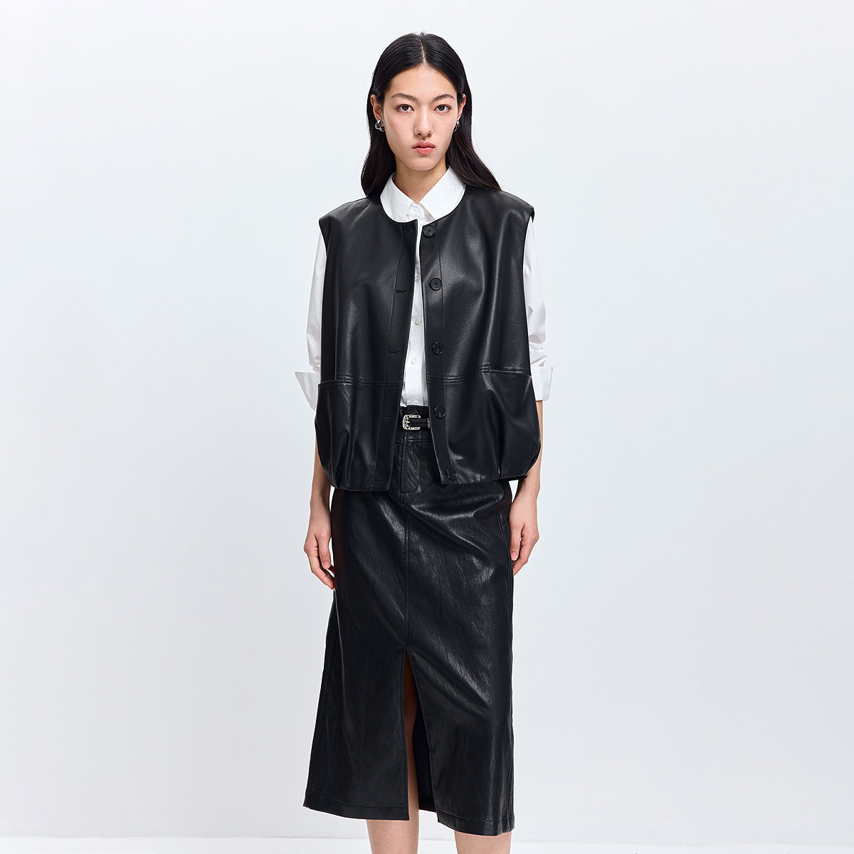 华吉言【漆夜】A级超薄蜡感羊皮H型宽松无袖皮衣百搭马甲上衣女