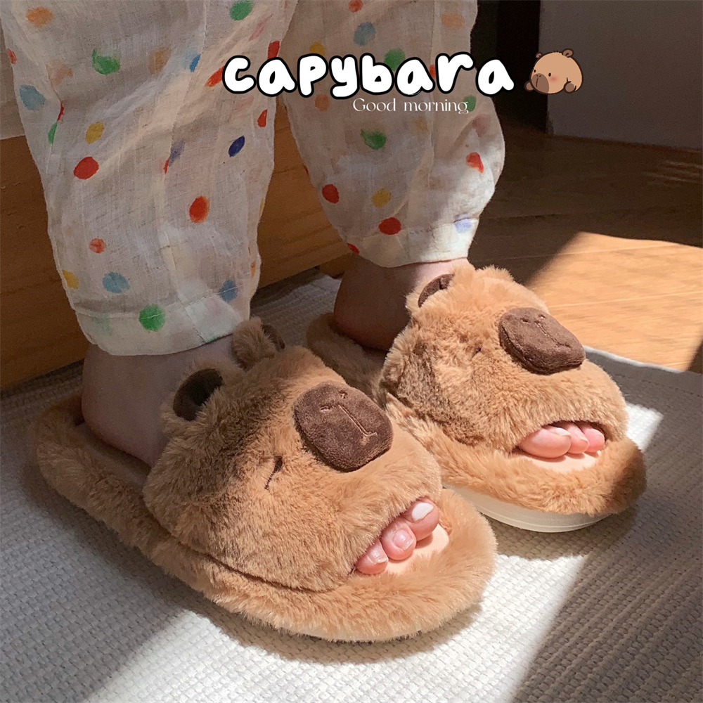 天猫舒适居家保暖趣味可爱毛毛拖鞋女秋冬丑萌卡皮巴拉水豚一字棉拖鞋