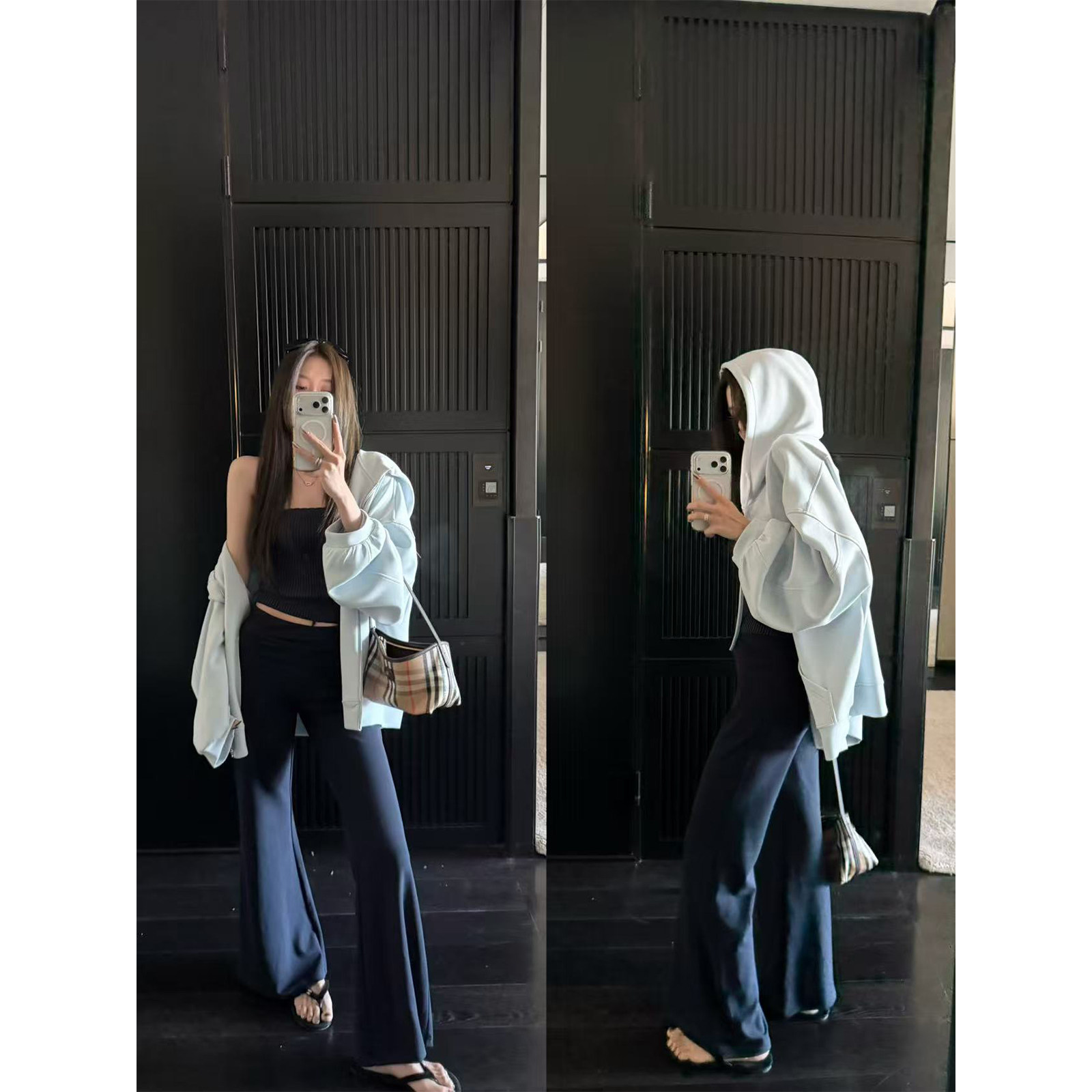 天【少女遐想】Uena明星同款黑色双腰头下摆抽绳休闲宽松直筒卫裤女