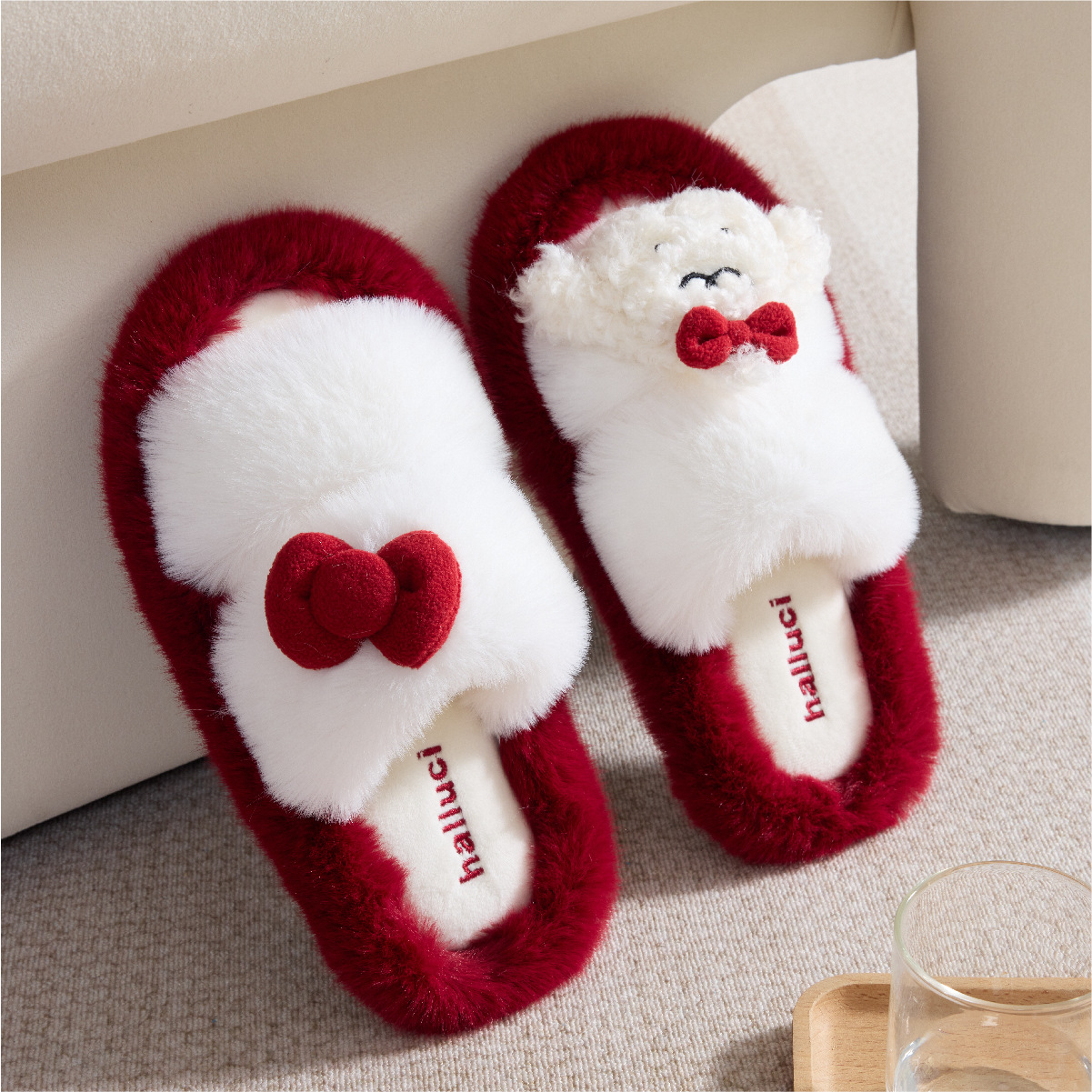 淘宝圣诞风蝴蝶结小狗毛绒冬季新款拖鞋加厚居家防滑防水棉拖女室内鞋