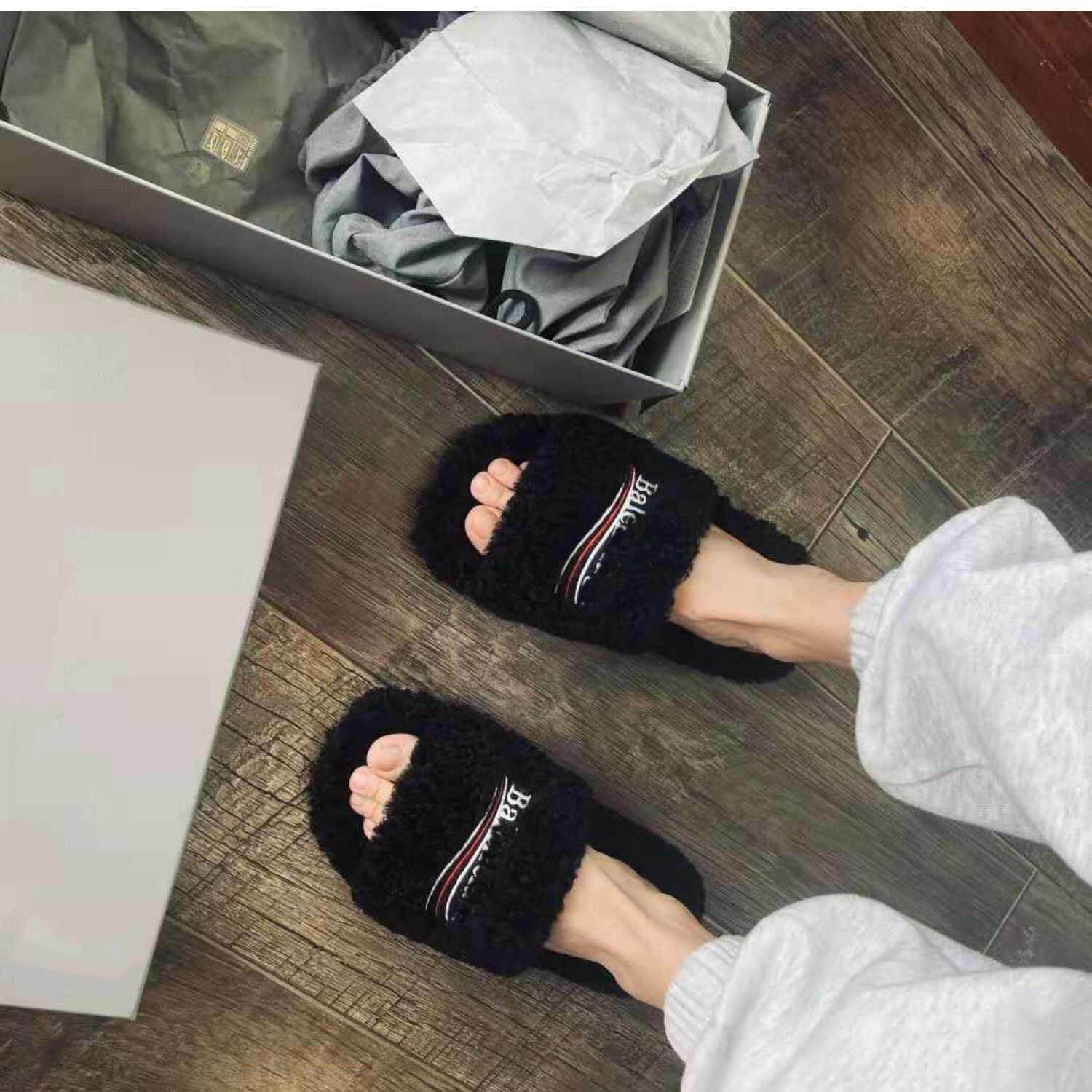 B家一字带轻奢毛毛拖鞋,专为都市女性打造的秋冬新款,融合时尚与舒适。采用优质仿毛绒内里,柔软亲肤,保暖性佳,轻松应对寒冷天气。简约一字带设计,搭配金属扣饰,彰显轻奢质感,轻松驾驭居家、出街等多种场景。防滑耐磨橡胶大底,行走稳健安心。平底设计贴合脚型,久穿不累,是今冬网红必备的休闲单品。无论是搭配大衣、针织裙还是休闲裤,都能 instantly 提升整体造型的慵懒时髦感,外穿内搭皆宜,温暖与颜值并存。