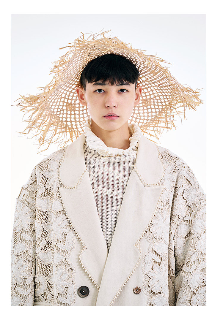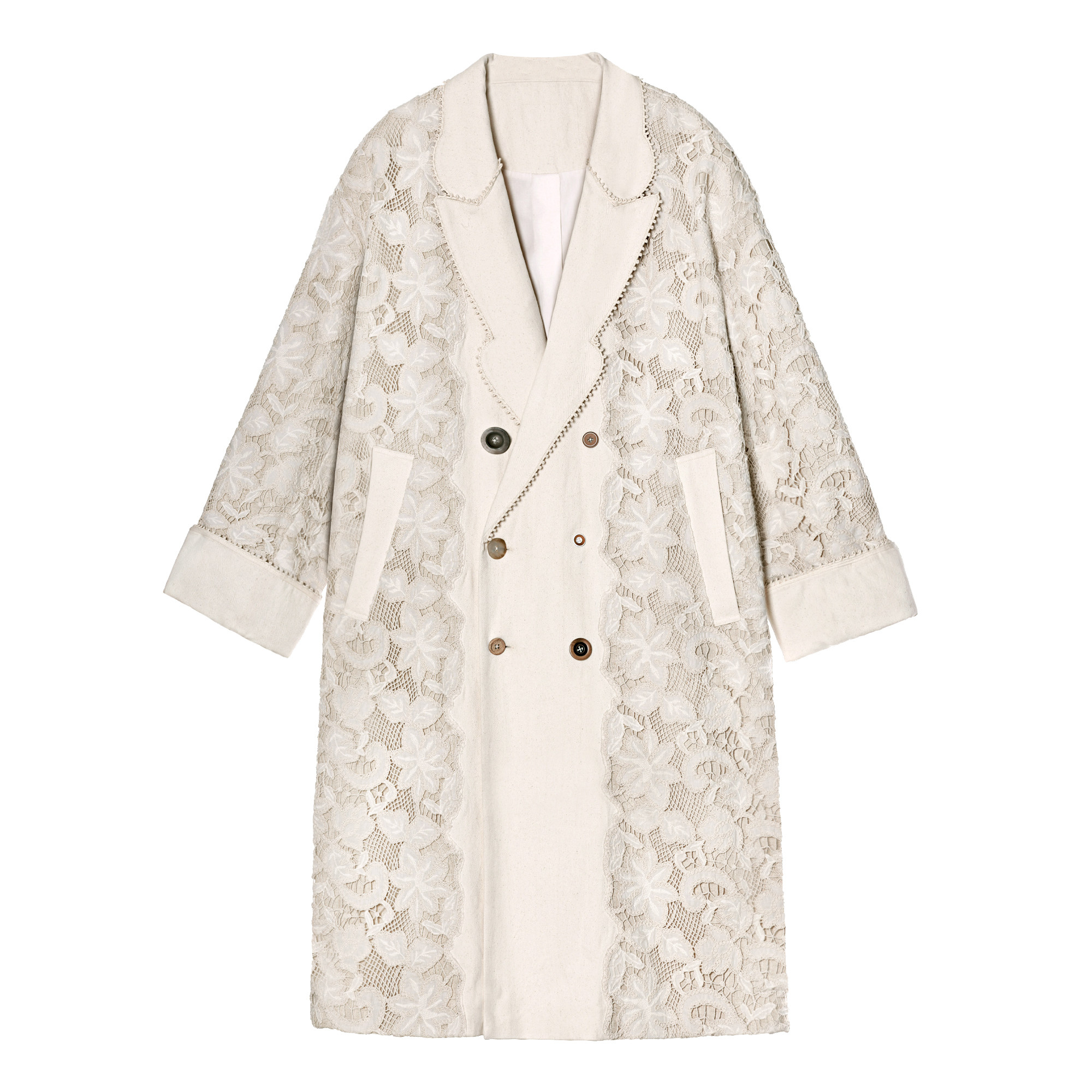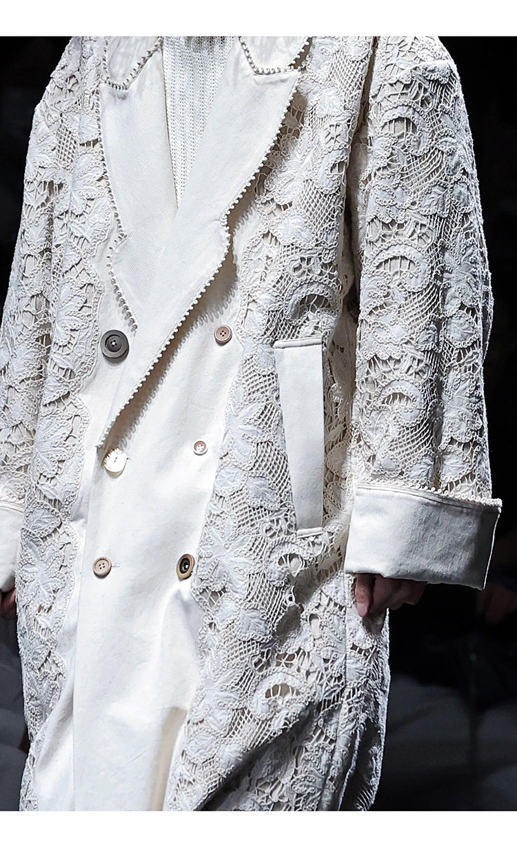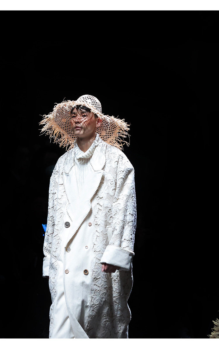 淘宝花穗 镂空卷草花纹拼接异形领棉麻落肩长款大衣 山谷少年男装设计
