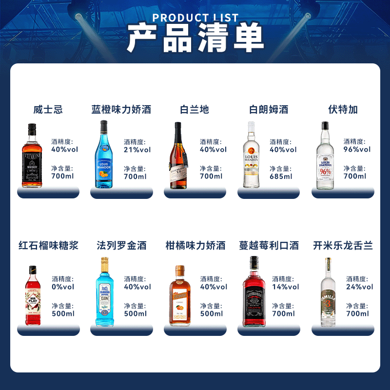 天伏特加蓝橙味力娇酒洋酒组合朗姆酒金酒白兰地调酒基酒鸡尾酒烘培